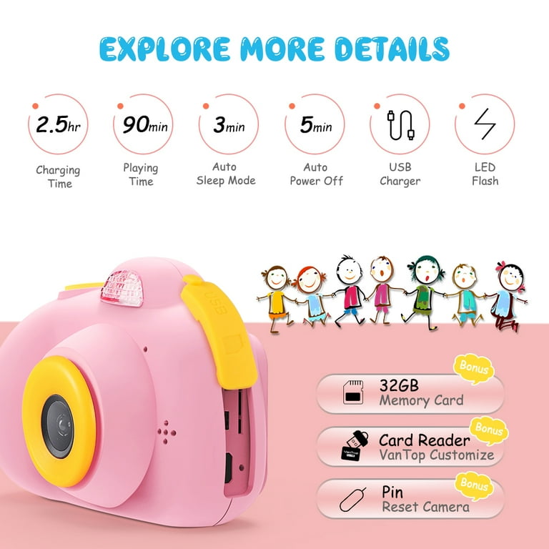 Made with quality and care, VanTop Junior K5 kids camera inspire a world of discovery and hands-on learning. Two and a half hours charging fulfills 90 minutes playing time.