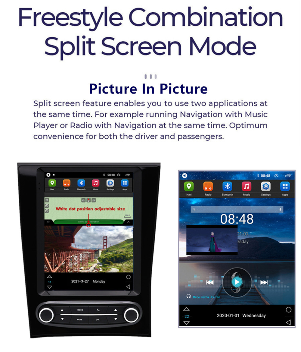 Display | - Touch Screen: Yes - Resolution: 1024*768 - Capacitive or Resistance Screen: Capacitive - Built-in Clock and Calendar: Yes, show real time and can use network-provided time- Main Menu Status Bar display: Can be changed to Music/Radio/BT-Stereo Player and Clock/Date/Week - Change Apps-Icon Position: Yes - Spilt Screen: Yes Split