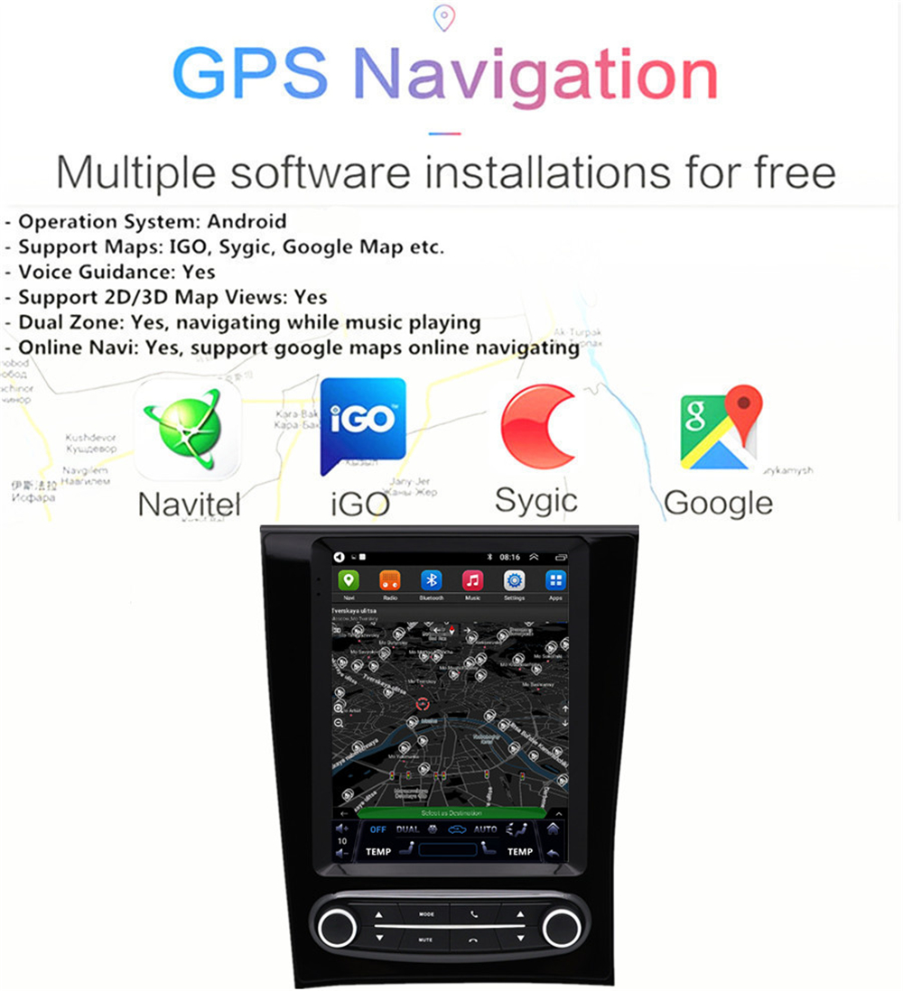 GPS | - Operation System: Android 13 - Support Maps: IGO, Sygic, Google Map etc. - Voice Guidance: Yes - Support 2D/3D Map Views: Yes - Dual Zone: Yes, navigating while music playing - Online Navi: Yes, support google maps online navigating |