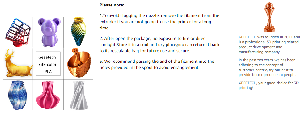 【Silky Shiny Color】Die spezielle Farbe von PLA Silk Filament bringt Kunst, Handwerk und 3D-Projekte Glatte glänzende Silberoberfläche, die definitiv auffällige, glänzende Drucke gibt. Es ist sehr geeignet, Dekoration oder Geschenk für alle Arten von Festival und Cosplay zu drucken.