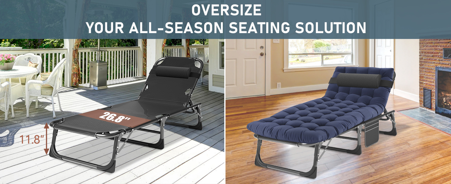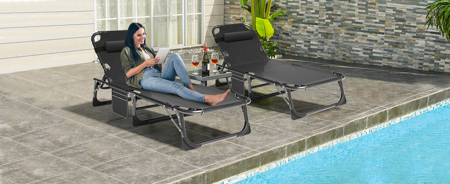 4 POSITIONS ADJUSTABLE: The adjustable lounge chairs are designed with 4 positions adjustable locking system, which allows you to adjust it to a comfortable position according to your needs. You can sit up, recline or lay flat;