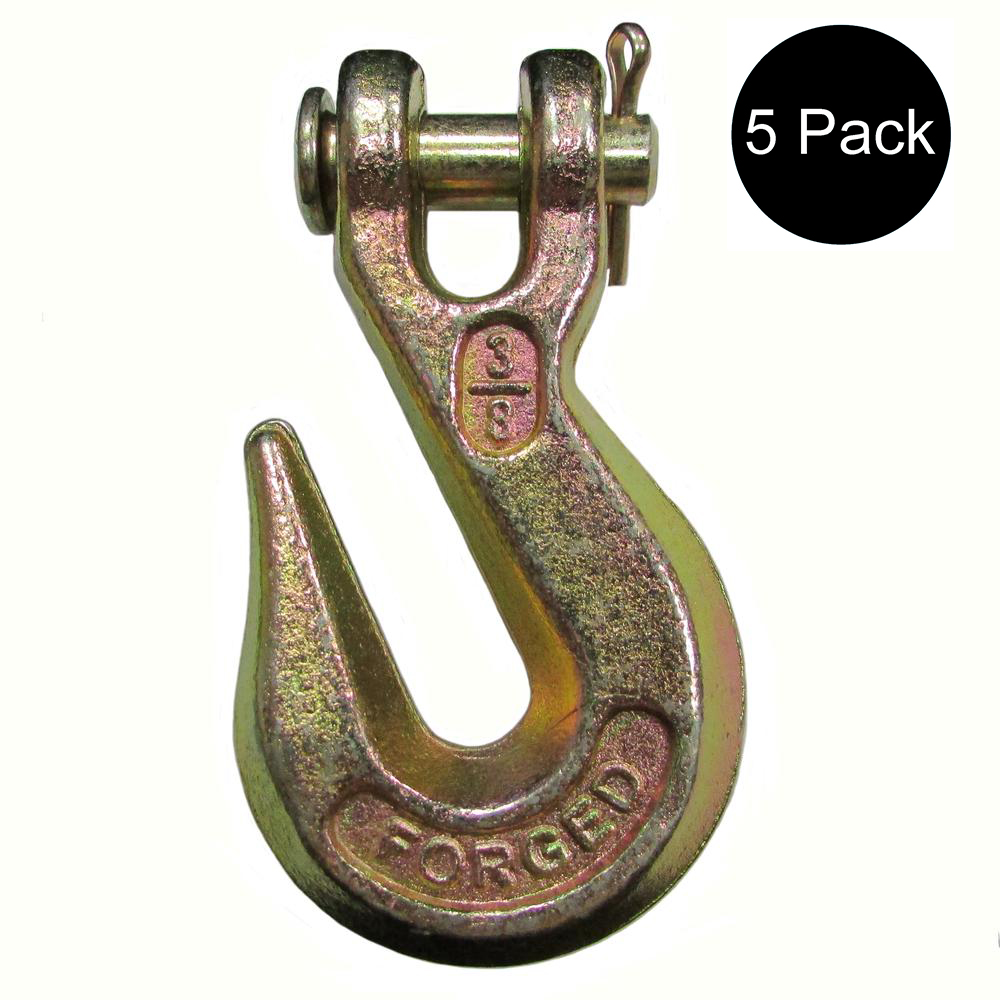 DESCRIPTION This set includes five (5) heavy duty 3/8" Grade 70 transport clevis grab hooks, each supplied with a clevis pin and cotter pin for secure attachment to tow chains, flatbed trailer tie-down chains, wrecker rigging, and cargo control systems. Grade 70 forged alloy steel hooks are the industry standard for transport and load securement applications. Each hook in this set is individually stamped G70 per DOT requirements. Wrecker and Towing: Tow trucks, wrecker rigging, recovery chains Flatbed and Trailer: Flatbed trailer tie-down chains, lowboy and step-deck trailers, cargo securement General Transport: Grade 70 transport chain connections, binder chain end hooks, safety chain attachments CHG38 WARNING: NOT recommended for overhead lifting. These hooks are rated for transport and cargo securement use only. Always inspect hooks before each use and verify load ratings before applying working loads. New aftermarket replacement part - not remanufactured, not used.Set of Five (5) New Grade 70 (G70) 3/8" Clevis Grab Hooks for Wrecker, Tow Chain, Flatbed Trailer, and Tie Down Applications