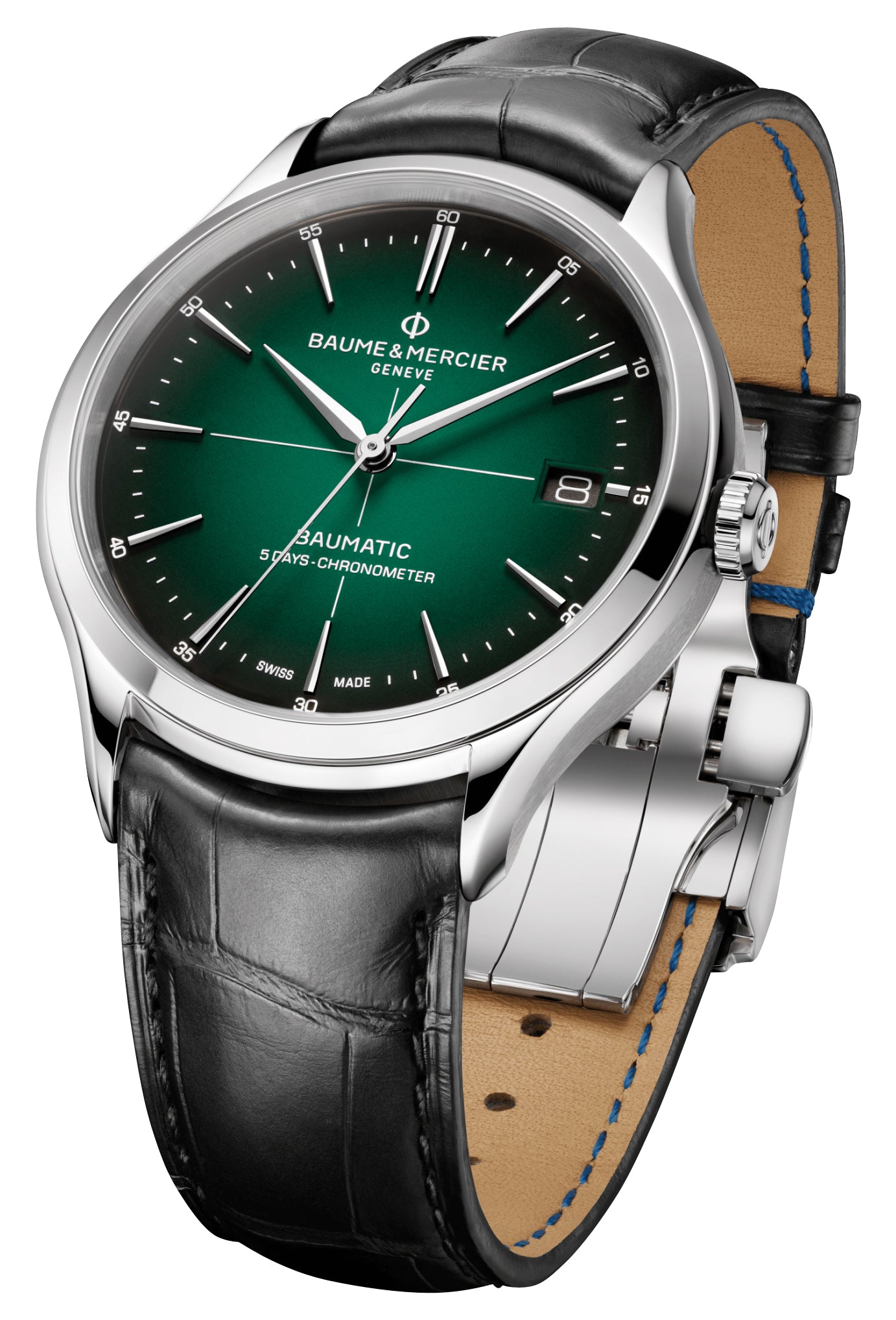 Like all of our watches, this Baume & Mercier Clifton Baumatic COSC Automatic Green Dial Black Leather Mens Watch is brand new and comes in its original packaging.