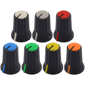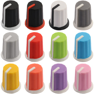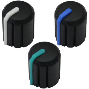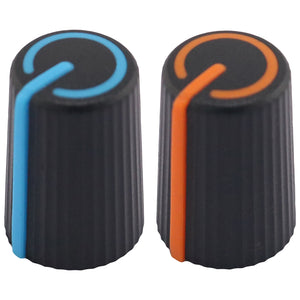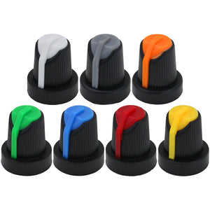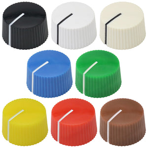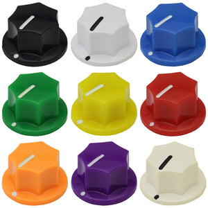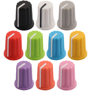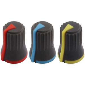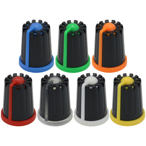 This control knob features a distinctive black body with an elegant flared design that widens towards the base. The vibrant coloured cap sits atop the knob and matches the position indicator line at the base, with a subtle cutout in the cap that aligns with the indicator for precise visual feedback during adjustments.