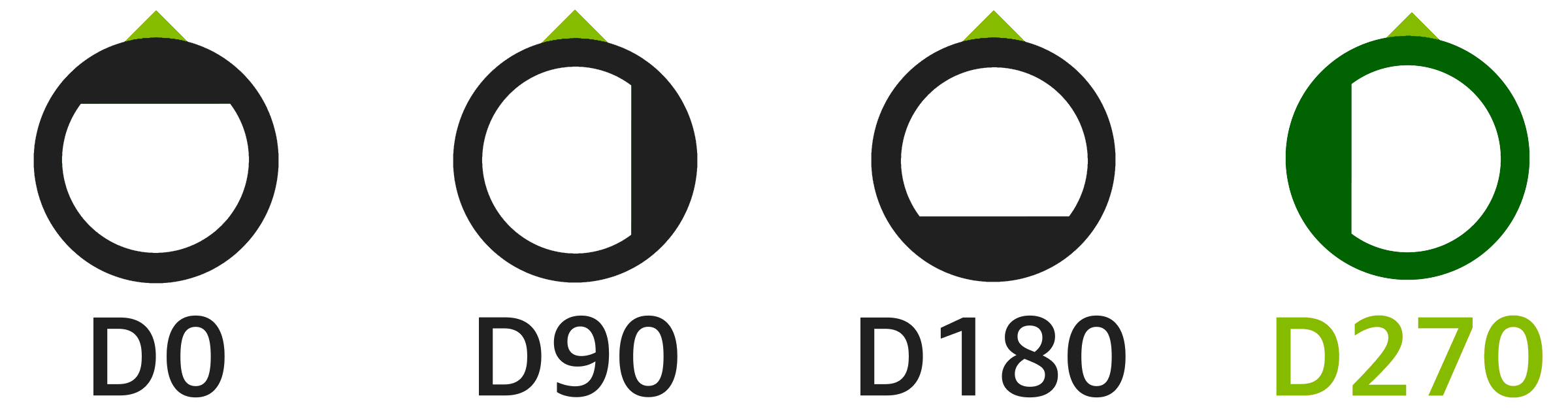 These knobs have a D270 position fitting. The chart below shows the different D-shaft positions (the position indicator relative to the flat of the 'D'). This view is of the bottom of the knob, looking into the hole:
