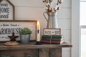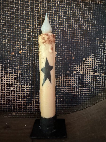 Hand-dipped and stenciled with primitive style, the candle is battery operated and will shine for 6 hours before automatically turning off. Easily set the timer to ensure the candle appears at the same time each day. Celebrate with a timeless classic crafted in the USA.