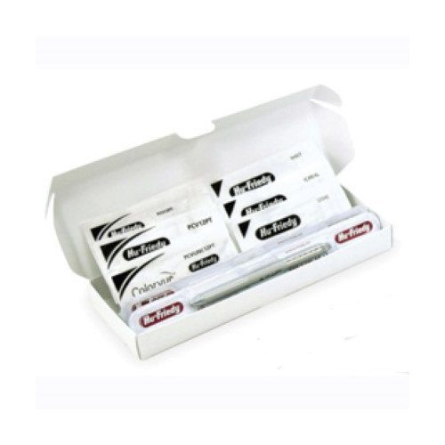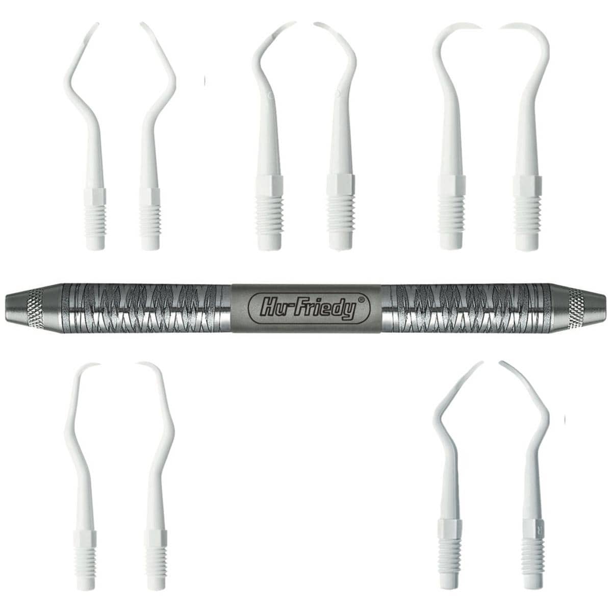 Implant scalers made of PLASTEEL a high grade, unfilled resin. 20% thinner tip improves access to implant abutment surfaces for more effective maintenance and care of implants. Various designs available. Kit: IMPLINTOR6 Implacare II Handle x 1 , Columbia 4R/4L Pair x 1, 204S Pair x 1, H6/H7 Pair x 1, Barnhart 5/6 Pair x 1 and Langer 1/2 Pair x 1