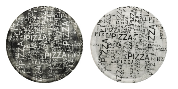 1 Pizza-Teller 31 cm Weiß mit schwarzer Schrift (rechter Teller) Restposten Sonderpreis |