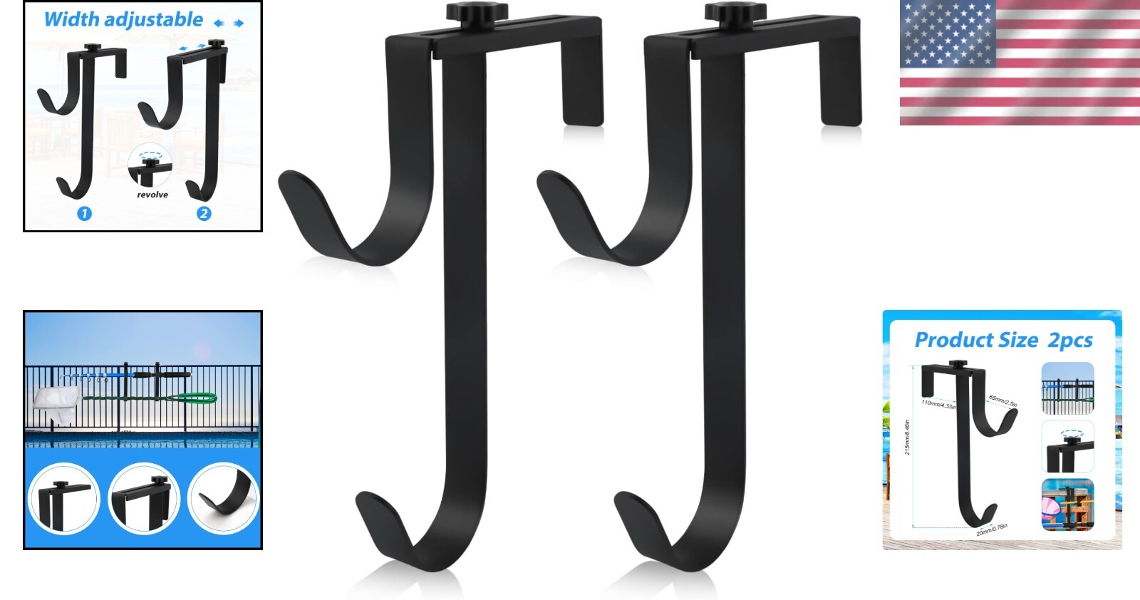 Package Contents: You will receive 2 pieces of adjustable pool fence hooks. Adjustable up to 11cm in width to fit most fences.