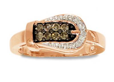 This is one of the most adorable rings your will ever see. 10K rose gold diamond fing is cleverly designed to give the appearance of a belt and buckle. Eight rich, chocolate brown diamonds form the center belt, while a row of white diamonds form the buckle which perfectly accentuate the band of chocolate diamonds. The chocolate brown and white diamonds make a wonderful combination with the sleek rose gold band. Such a fun and stylish ring...you will love it!