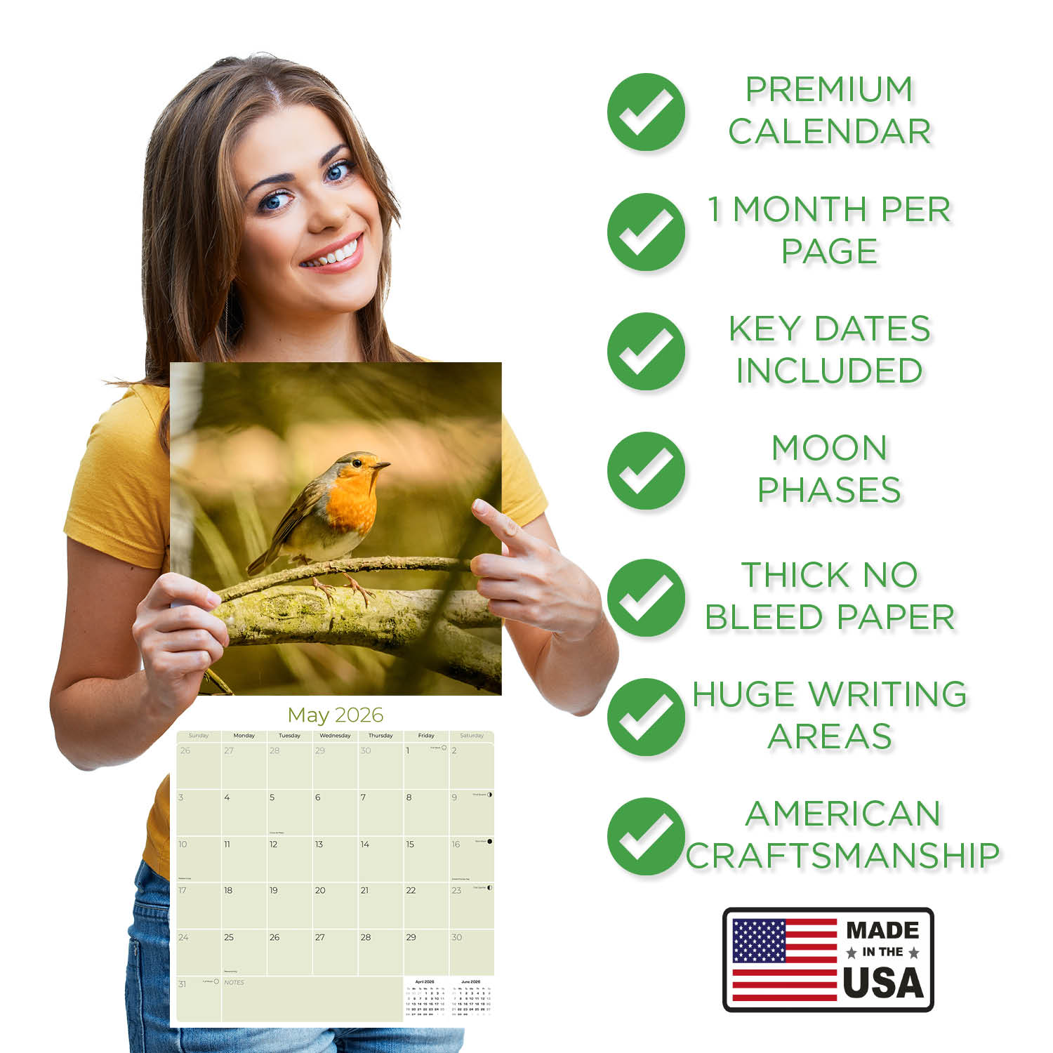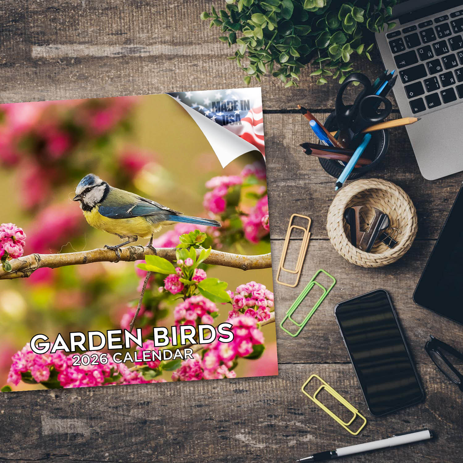The Garden Birds Calendar 2026 not only features fabulous photography sure to brighten your day, but also includes a wide open grid with ample space to jot down all of those special dates and anniversaries. In a world awash with digital alerts, a physical wall calendar is a nostalgic anchor. Each marked adventure and penned milestone transforms it into a mosaic of memories. Beyond noting dates, its spaces blossom with doodles, sketches, and quotes. Engaging with it revives a tactile sense of time and encourages mindfulness. Each month's turn prompts reflection and goal-setting. Amid digital chaos, the wall calendar stands as a tangible testament to life's moments, grounding us in our journey.MegaCalendars, nestled in Traverse City, Michigan, is your boutique graphic design studio crafting unique calendars and greeting cards. Our products go beyond mere tools for organization, they are tangible companions that navigate time with you. Proudly made in the USA, MegaCalendars is grateful that our products contribute to your everyday special moments.