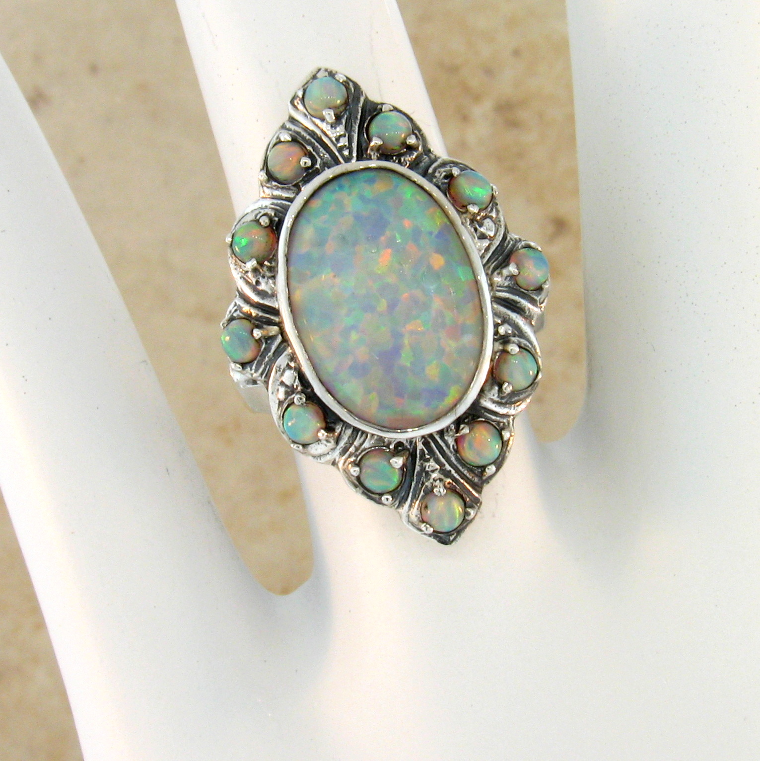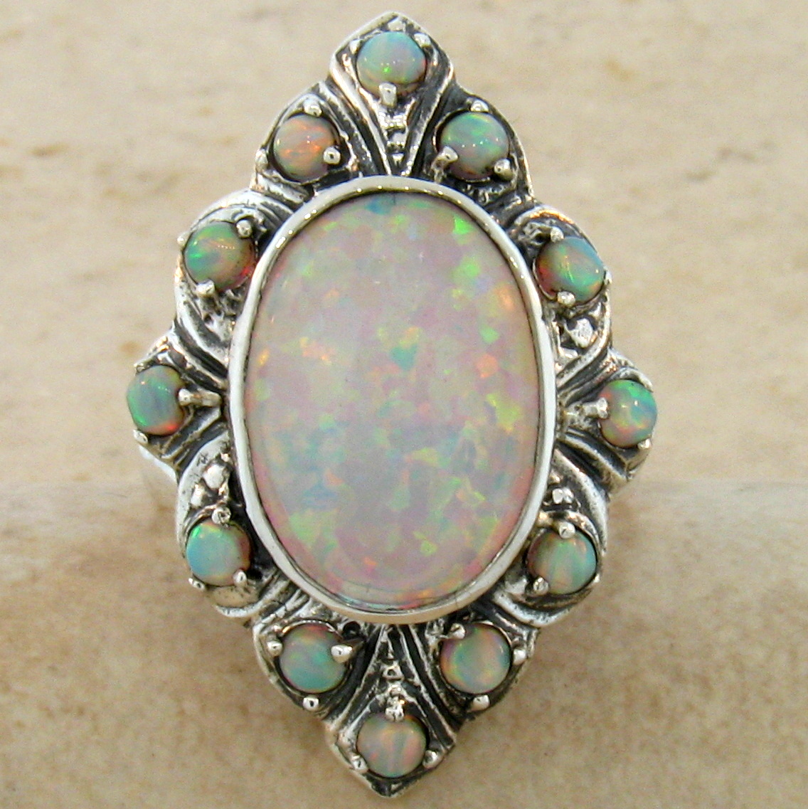 Victorian Style Opal .925 Sterling Silver Ring. The Top Of The Ring Measures 1 Inch In Length. This Is A Large Antique Victorian Reproduction Set With One High Quality 14 x 10 mm Lab-Created Opal Stone & Has Synthetic Opal Accents. Inspired By The Original Designs Of The Victorian To The Art Deco Period, 1836-1935. Item Is Stamped 925. Our Silver Is Genuine 925 Sterling Silver.
