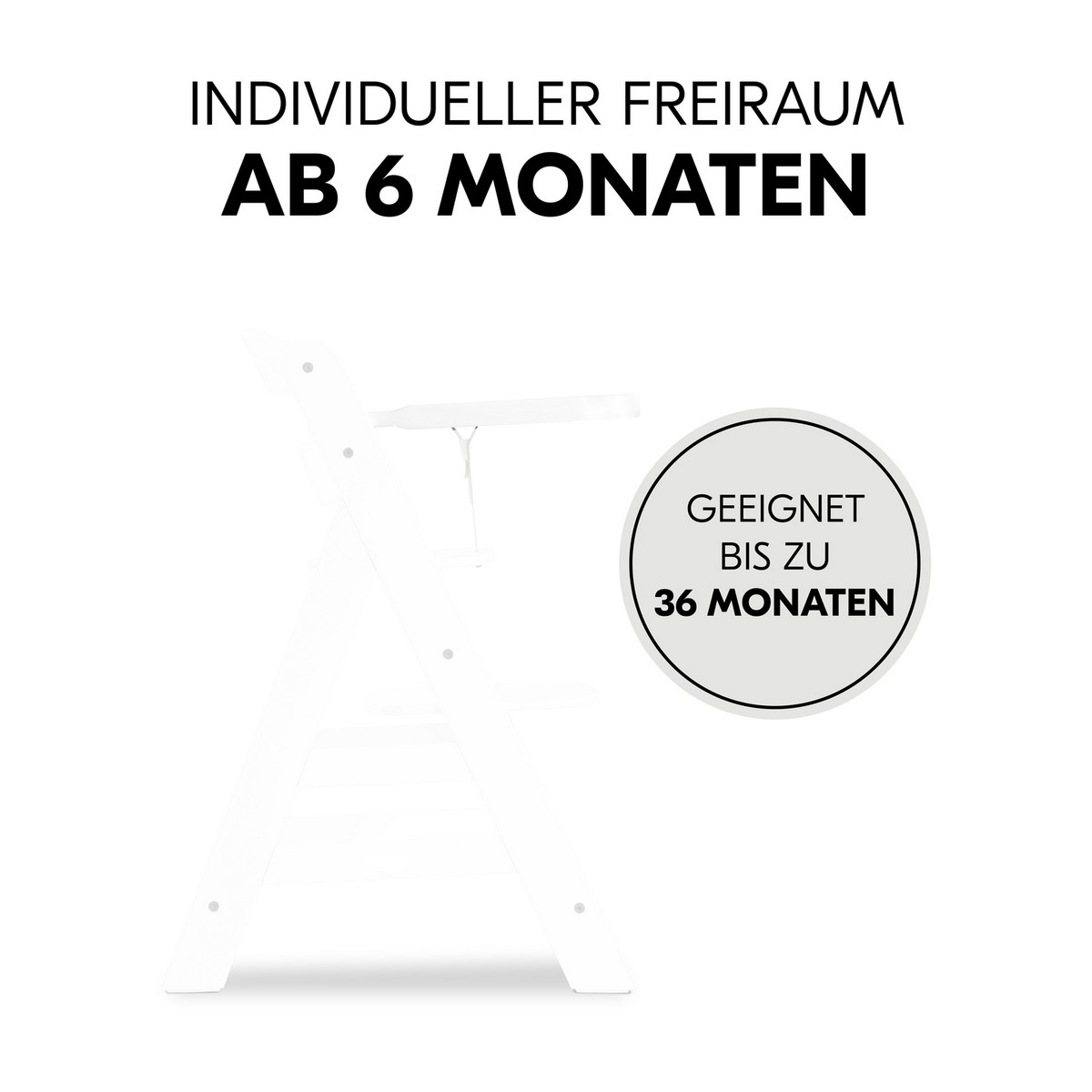 Im Kinderstuhl mit Tablett sitzt dein Kind sicher und stabil, da du den Tisch mit Schrittgurt und 5-Punkt-Gurt nutzen kannst. Das großzügig geschnittene Tablett bietet viel Platz für Teller, Becher und Tassen zum Essen sowie für kleine Spielsachen. In Wohnzimmer, Kinderzimmer, Küche oder Bad – mit dem Alpha+ sitzt dein Kind im Holzhochstuhl immer auf Augenhöhe bei dir.