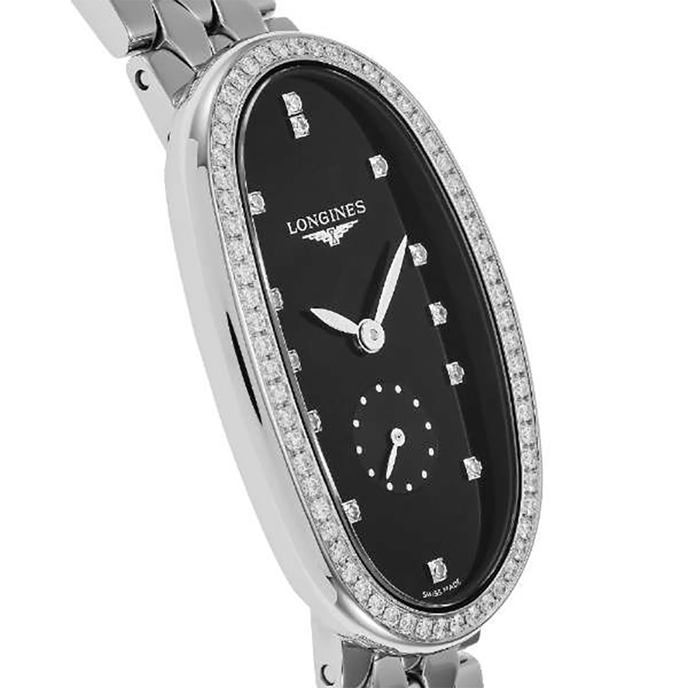 Like all of our watches, this Longines Symphonette Stainless Steel Black Dial Diamonds Quartz Womens Watch is brand new and comes in its original packaging.