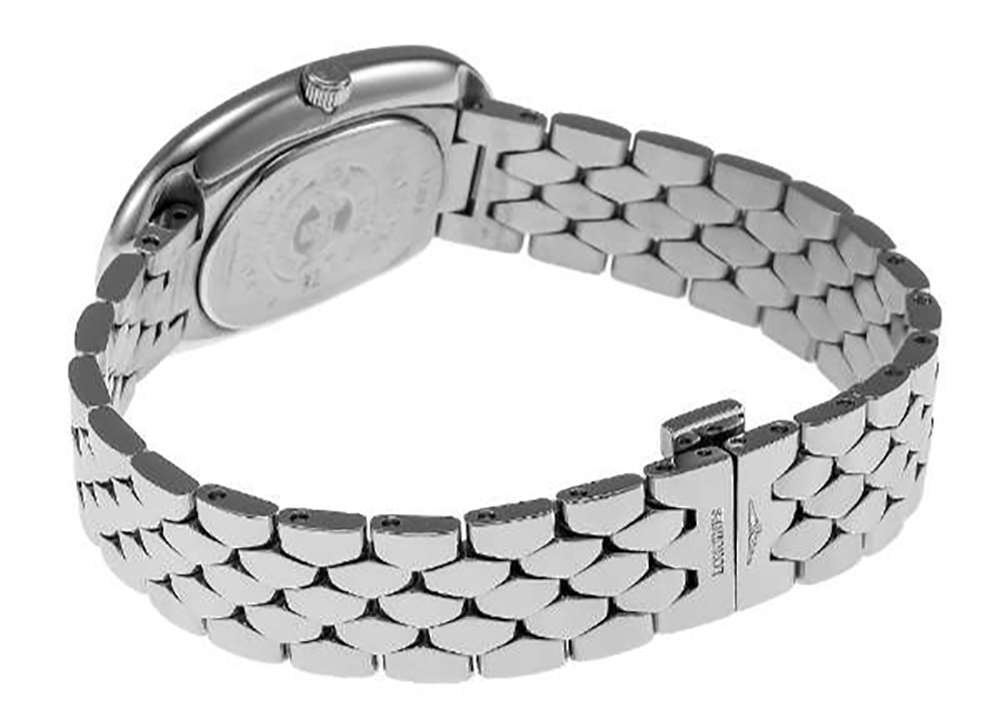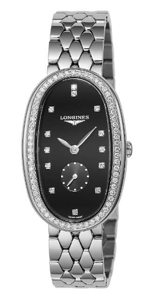 Named after a renowned classical orchestra during the 1940s and 1950s, Longines' Symphonette collection is delicate and refined, boasting slender and elegant timepieces oozing with femininity with its oval cases. This Symphonette features a 24.9 mm x 38.6 mm stainless steel ovoid case that holds a black dial under a scratch-resistant sapphire crystal. Its ellipse bezel is paved with 64 sparkling diamonds perfectly complementing the other 13 diamonds inside the simple yet elegant dial which serves as hour markers. It also has silver-tone leaf hands, a signed crown at the 3 o'clock position and a sub-seconds register at the 6 o'clock position. A stainless steel bracelet with a hidden folding clasp completes the sleek and elegant look. This watch has a solid caseback engraved with Longines' old winged hourglass logo with the Ernest Francillon & Compagnie signature (EFCo). Encased within is the Swiss quartz movement and is water-resistant up to 30 meters/100 feet.