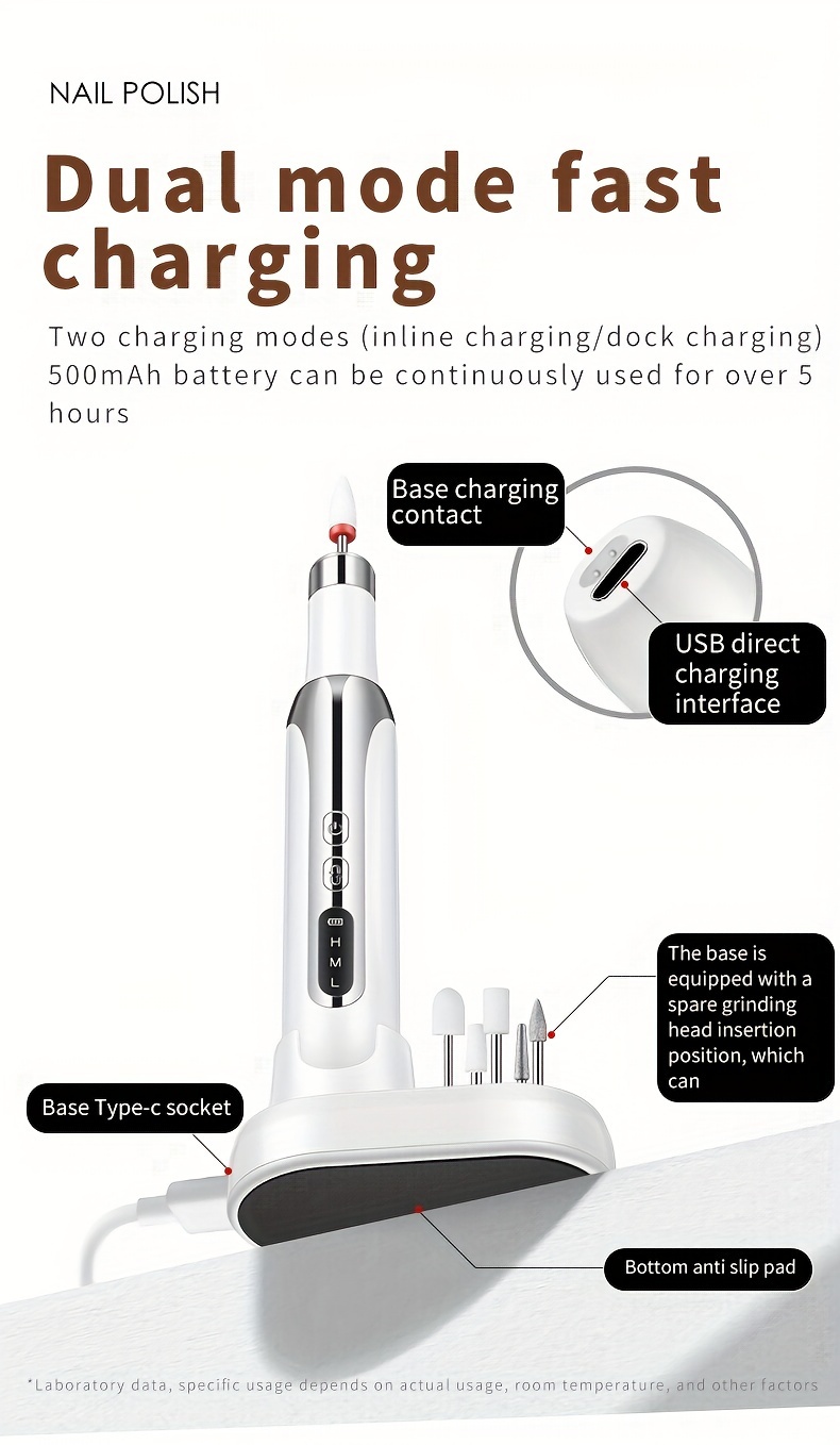 5. Equipped with a rechargeable non-slip base, this nail instrument supports in-line charging and base charging; the base has 6 storage ports for grinding heads, which is more convenient to use.