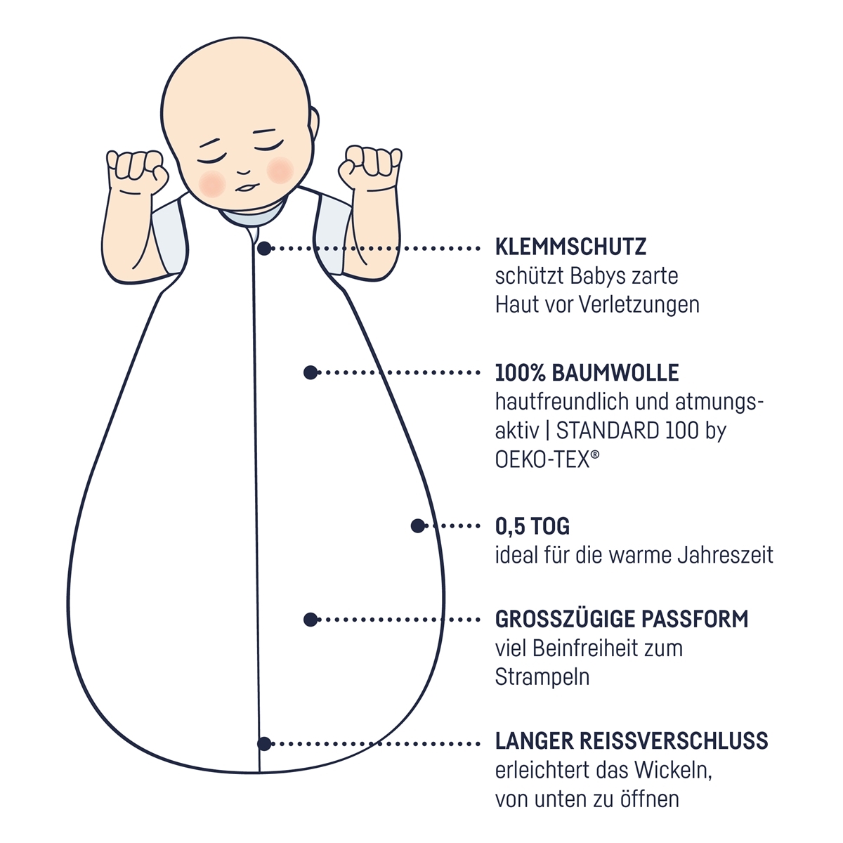 Der kuschelige Schlafsack besteht aus 100% Baumwolle und ist mit 100% Polyester gefüllt. Der nach Öko-Tex Standard 100 zertifizierte Schlafsack ist bis 60°C waschbar und trocknergeeignet.