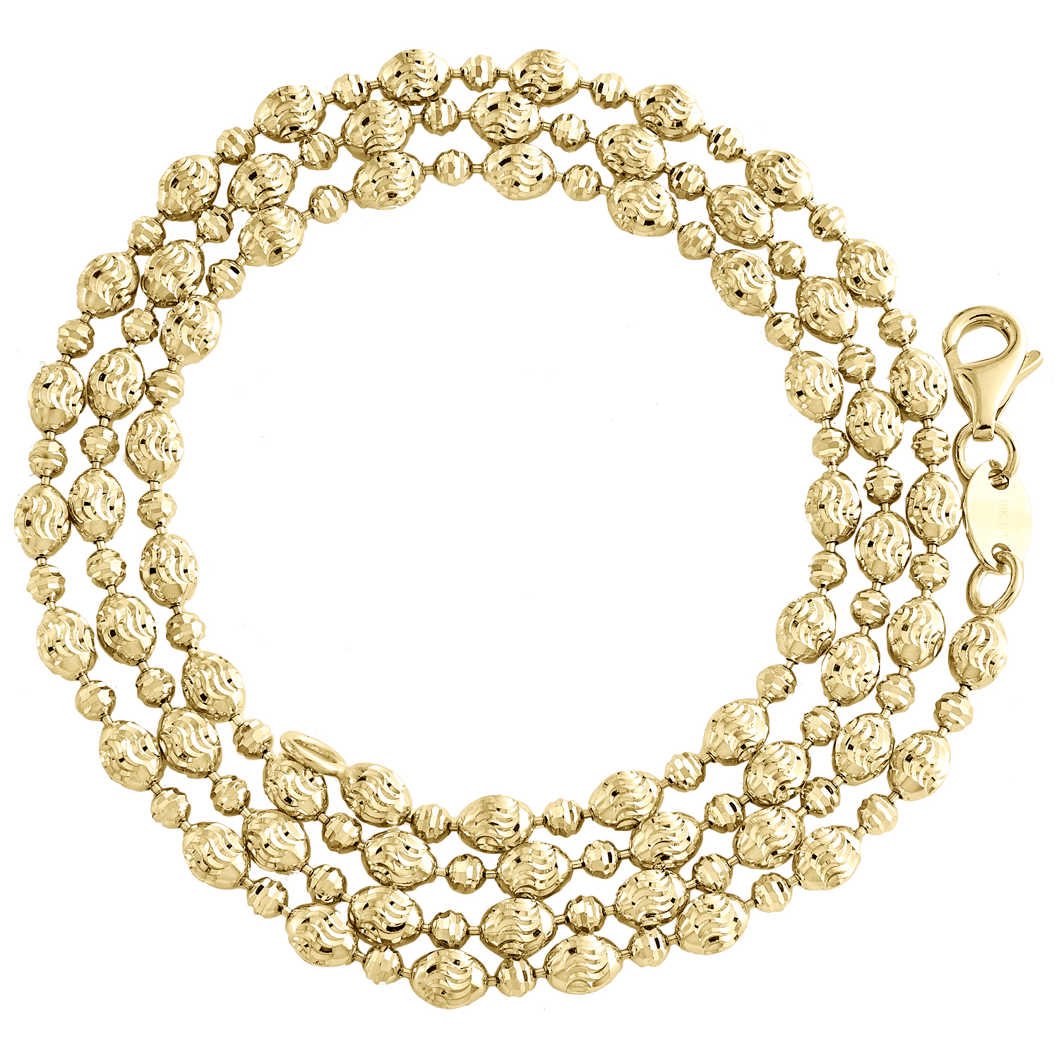 This elegant Moon Cut / Candy Beaded Link Necklace is crafted in lustrous 10K Yellow Gold. This fancy design measures 18" in length and 3mm wide. A Lobster clasp closure insures your necklace is secured in style. This chain weighs approx. 7 gr. This chain is made using special technique which gives it a high-end luster finish. Trendy and beautiful, this stylish necklace is a unisex style. One of a kind fancy statement link gold bracelet will make a great addition to your jewelry collection.