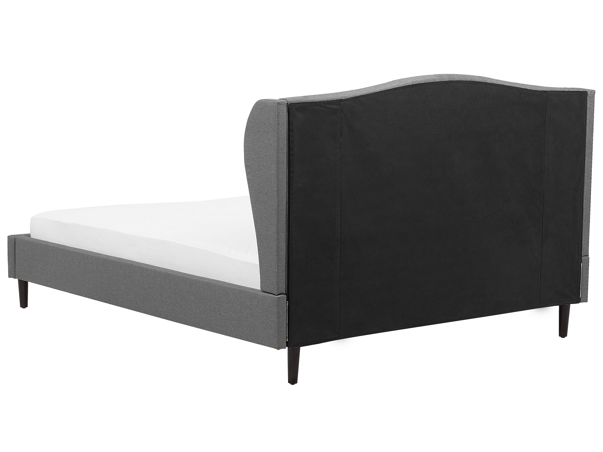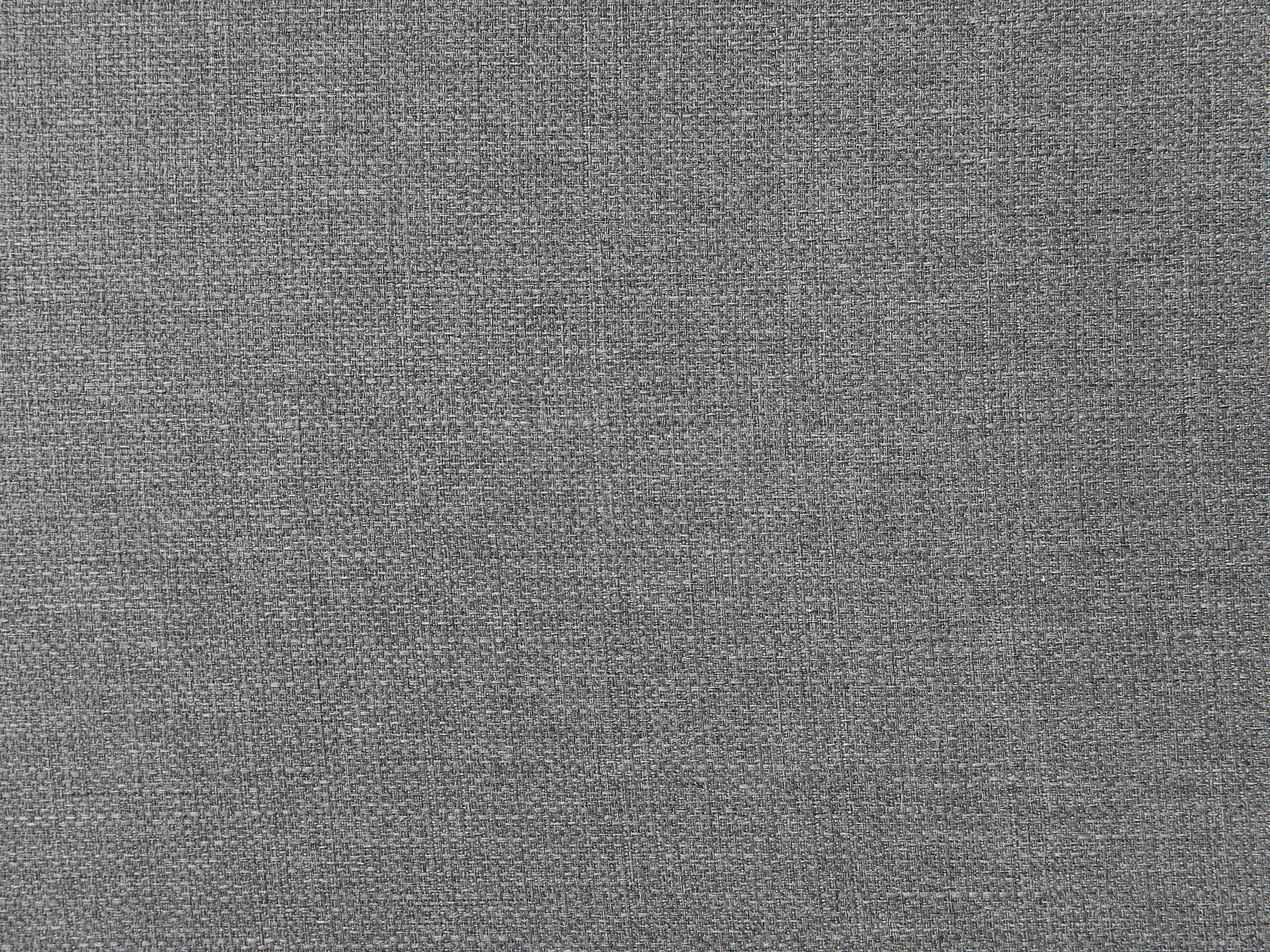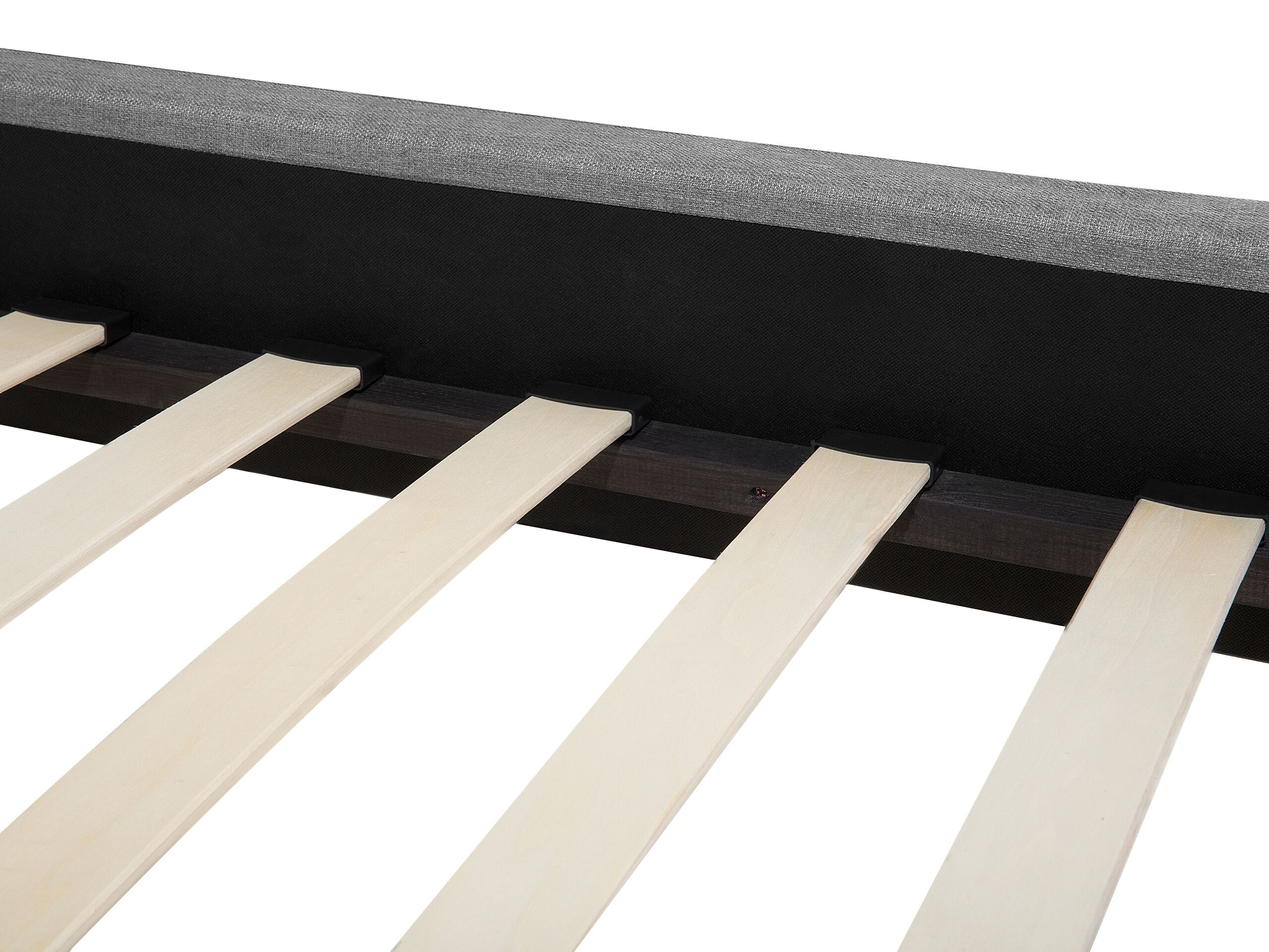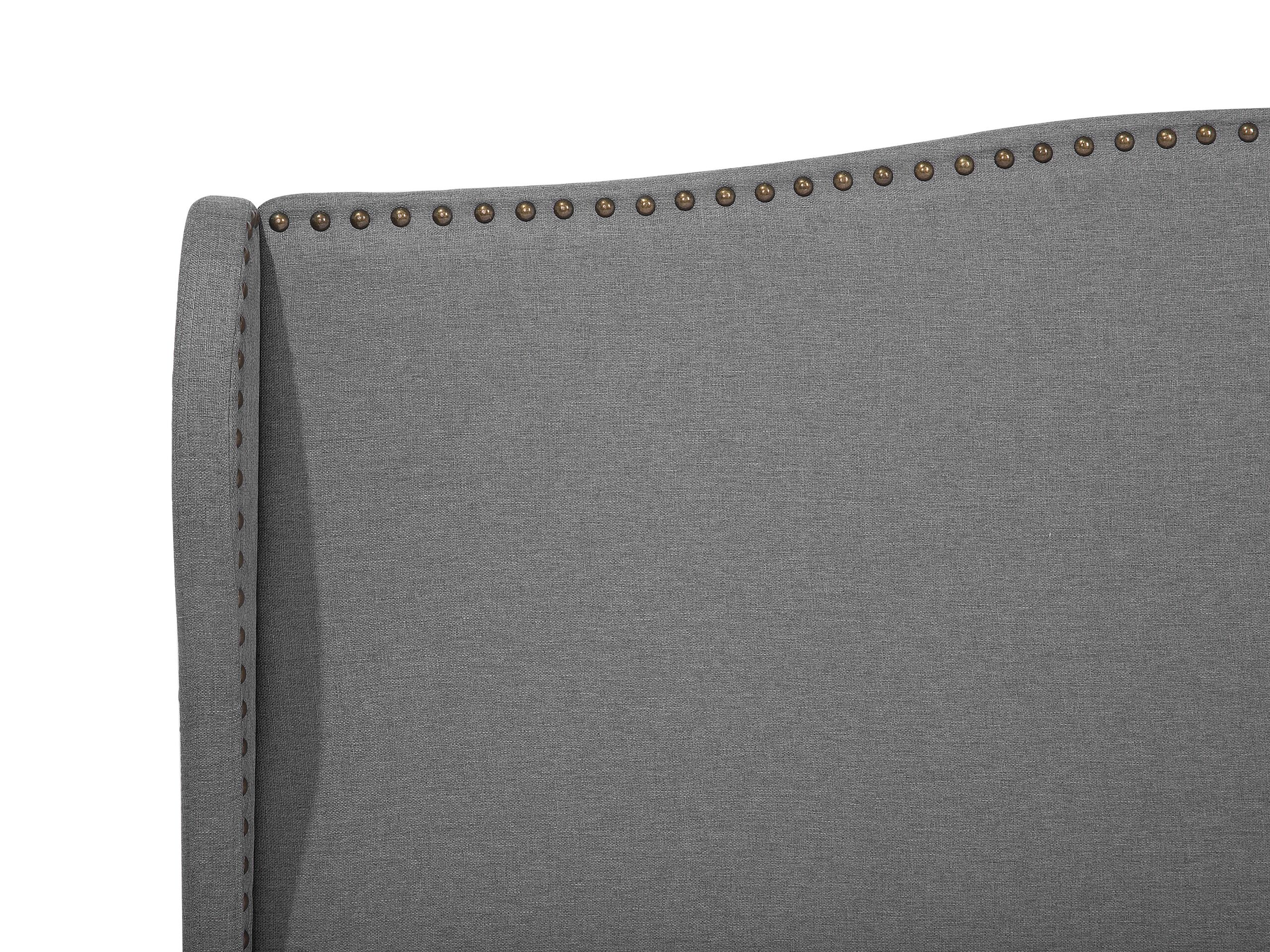Comfortable Bed with Chic Headboard in Grey. An elegant frame and beautifully crafted headboard combined with the highest comfort standards, this bed has it all. Covered in high-quality wear-resistant linen, the piece boasts an upholstered headboard with a slightly curved shape that brings to mind the most comfortable armchair. Featuring decorative metal studs, this bed is the epitome of classic design.
