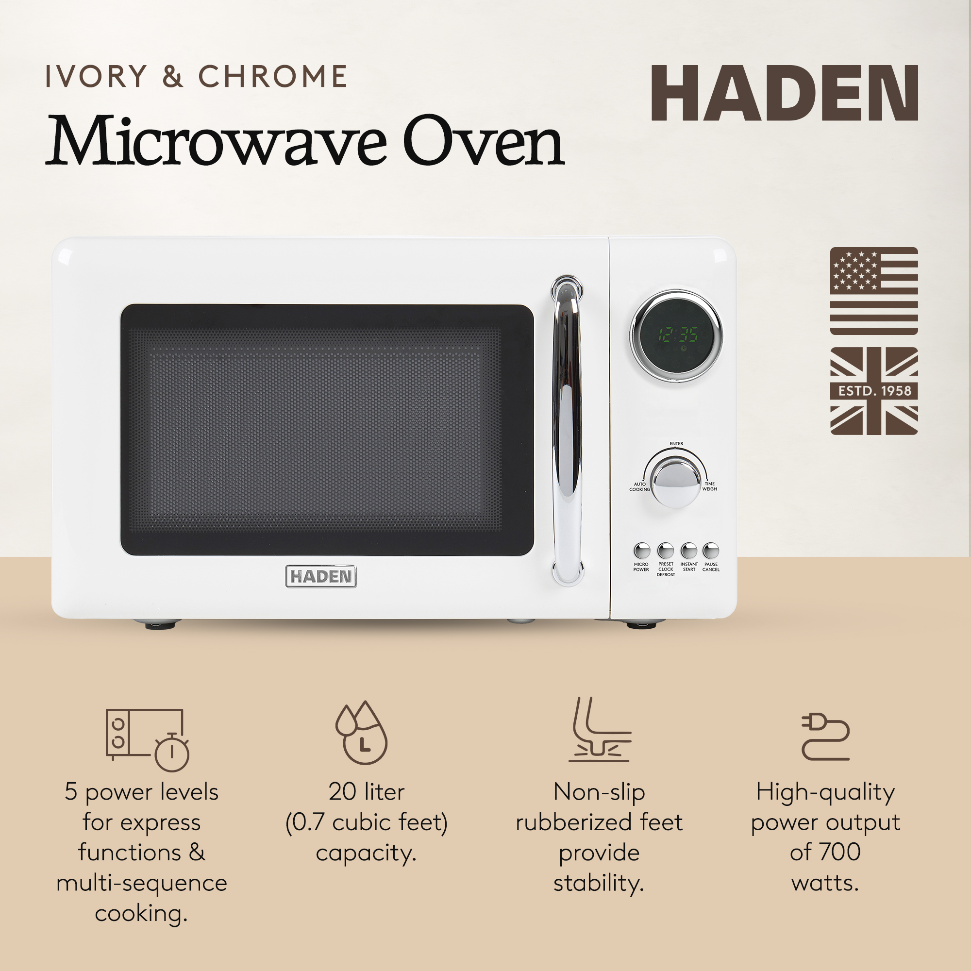 Create a classic and sophisticated look in your kitchen with the Haden Microwave Oven. With a sleek, sophisticated design, this microwave complements any countertop, adding a touch of elegance to your kitchen. Boasting a 0.7-cubic-foot capacity and 700-watt power, it efficiently handles your cooking needs. The digital controls offer easy operation, while the defrost and Instant Start functions simplify meal prep.