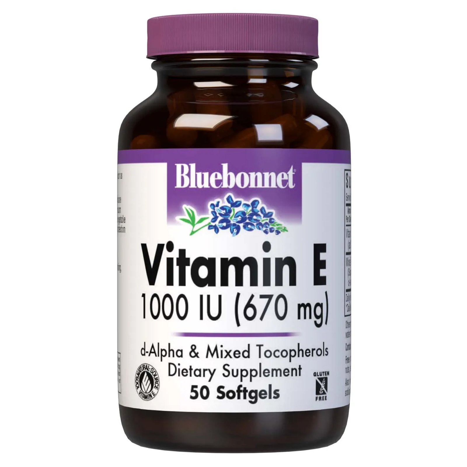 Bluebonnet’s Vitamin E 1000 IU (670 mg) Mixed Softgels are specially formulated with d-alpha tocopherol and full spectrum of tocopherol isomers (beta, delta and gamma) in a base of vegetable oil. Vitamin E is an antioxidant that provides free-radical protection as well as cardiovascular support. Available in easy-to-swallow softgels for maximum assimilation and absorption.