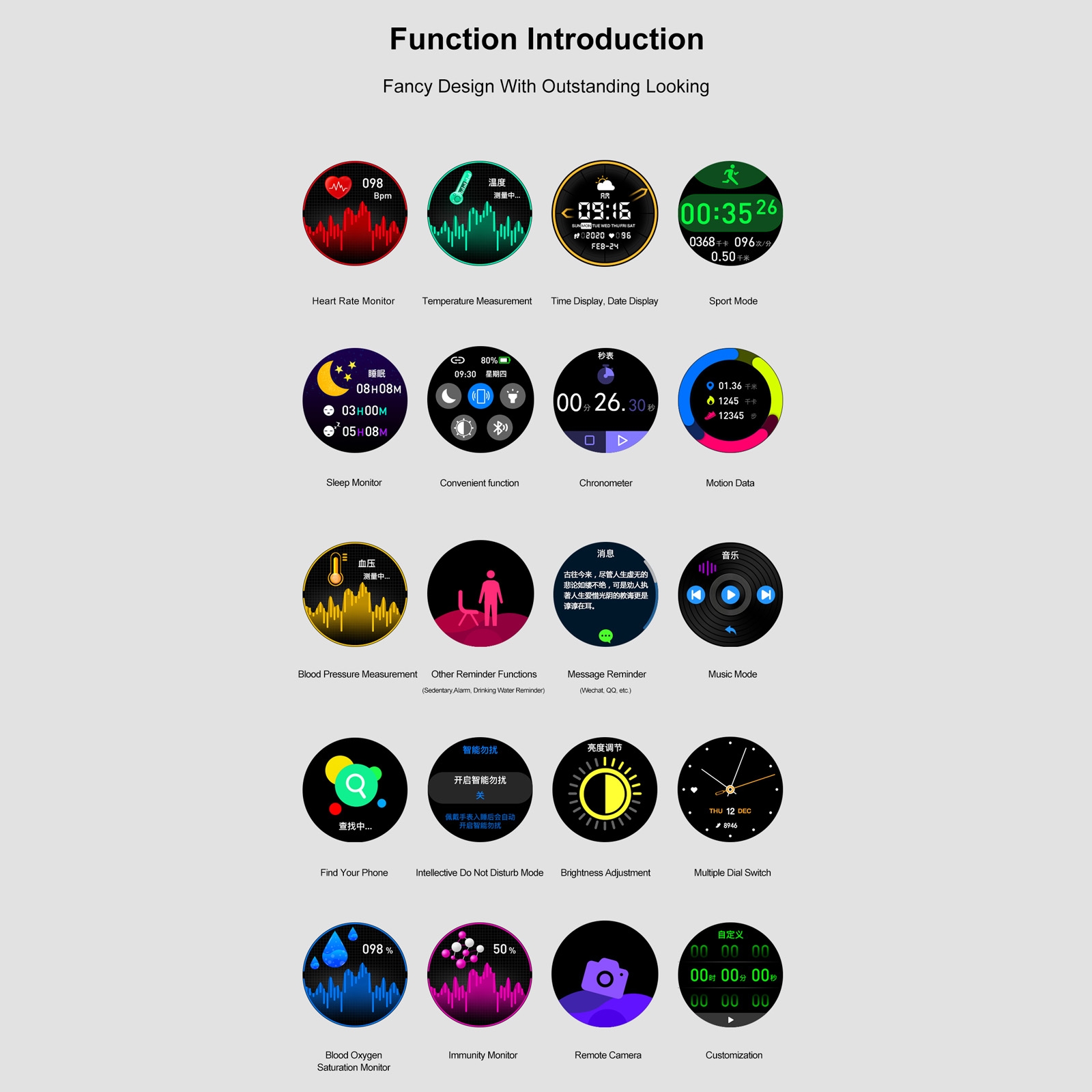 1. Display screen: 1.28 inch round, resolution 320*320 2. Battery capacity: 310mAH 3. Material: upper cover zinc alloy / body zinc alloy / clasp zinc alloy / strap silicone 4. RAM (random access memory): 128KB 5. SFlash (read only memory): flash 512KB 6. External flash: 128M 7. Bluetooth version: 5.0 8. Compatible system: Android system version 4.4 or higher, IOS system version 8.4 or higher 9. Charging method: magnetic charging 10. Firmware language: Chinese, English, French, Spanish, Portuguese, Russian, Polish, Thai 11. Functions: pedometer, calories, sleep monitoring, alarm clock reminder, multi-sports mode, sedentary reminder, call reminder, SMS reminder, remote camera, heart rate monitoring, blood oxygen monitoring, body temperature monitoring, etc. 12. Wristband size: 245x22x2.5mm, body size: 45x10.9mm 13. Weight: 48g