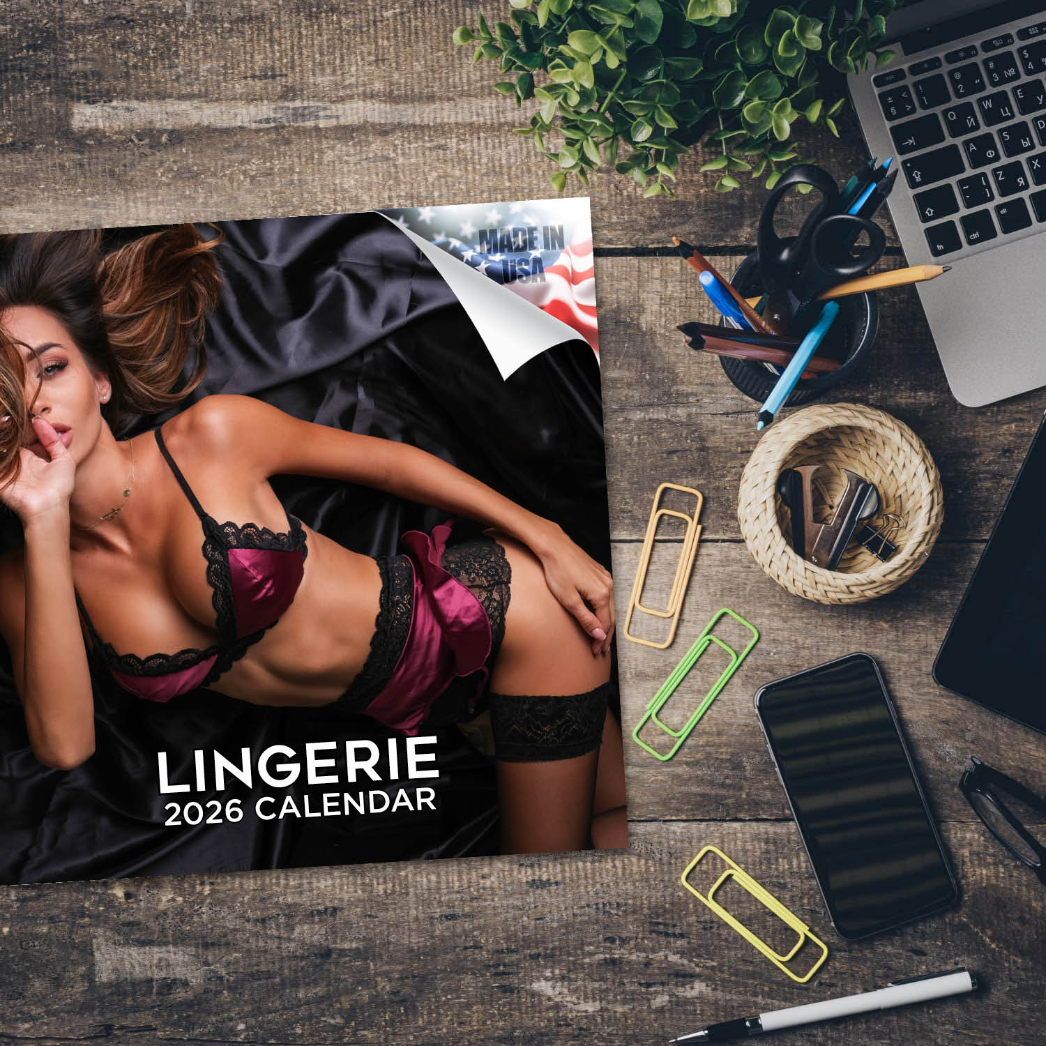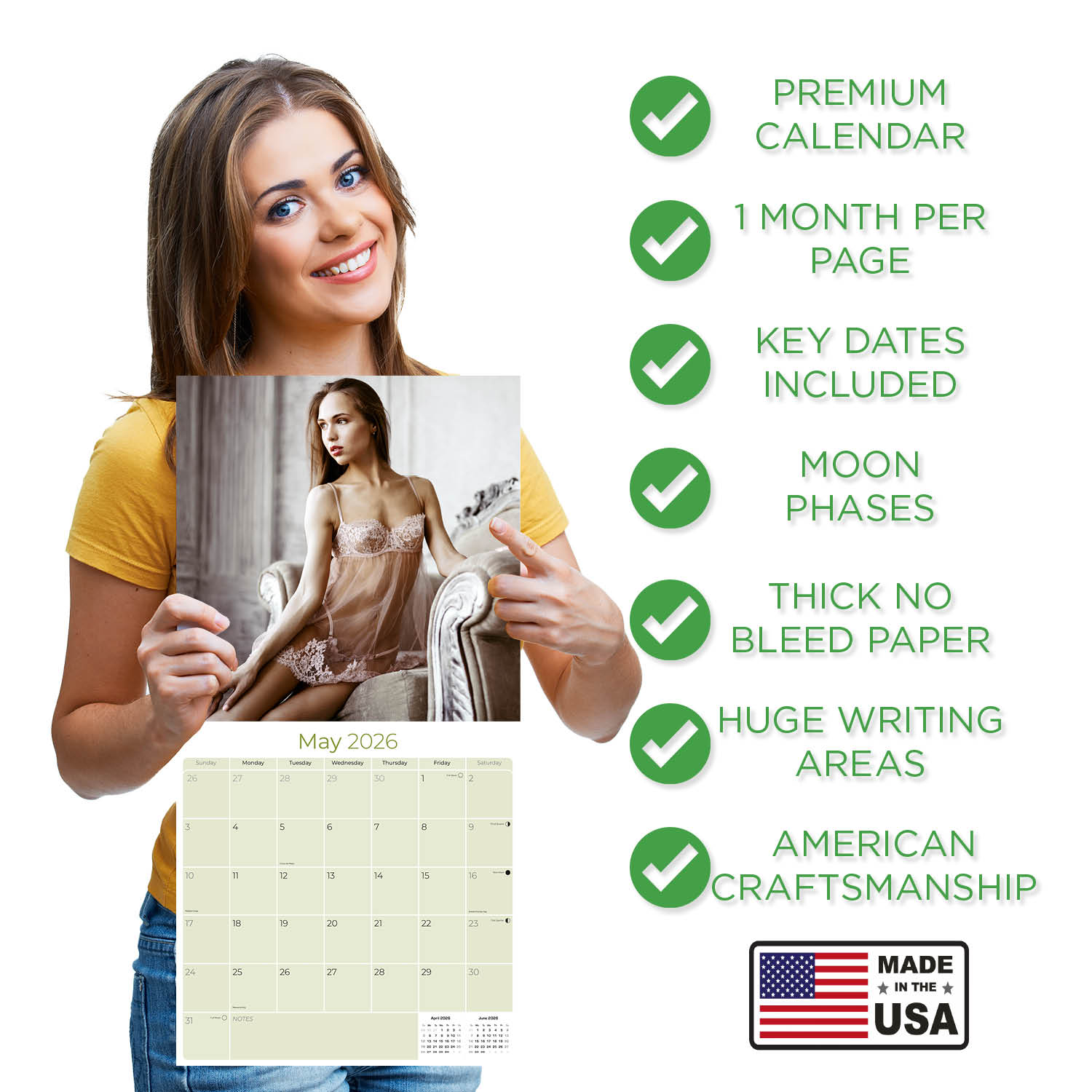 The Lingerie Calendar 2026 not only features fabulous photography sure to brighten your day, but also includes a wide open grid with ample space to jot down all of those special dates and anniversaries. In a world awash with digital alerts, a physical wall calendar is a nostalgic anchor. Each marked adventure and penned milestone transforms it into a mosaic of memories. Beyond noting dates, its spaces blossom with doodles, sketches, and quotes. Engaging with it revives a tactile sense of time and encourages mindfulness. Each month's turn prompts reflection and goal-setting. Amid digital chaos, the wall calendar stands as a tangible testament to life's moments, grounding us in our journey.MegaCalendars, nestled in Traverse City, Michigan, is your boutique graphic design studio crafting unique calendars and greeting cards. Our products go beyond mere tools for organization, they are tangible companions that navigate time with you. Proudly made in the USA, MegaCalendars is grateful that our products contribute to your everyday special moments.