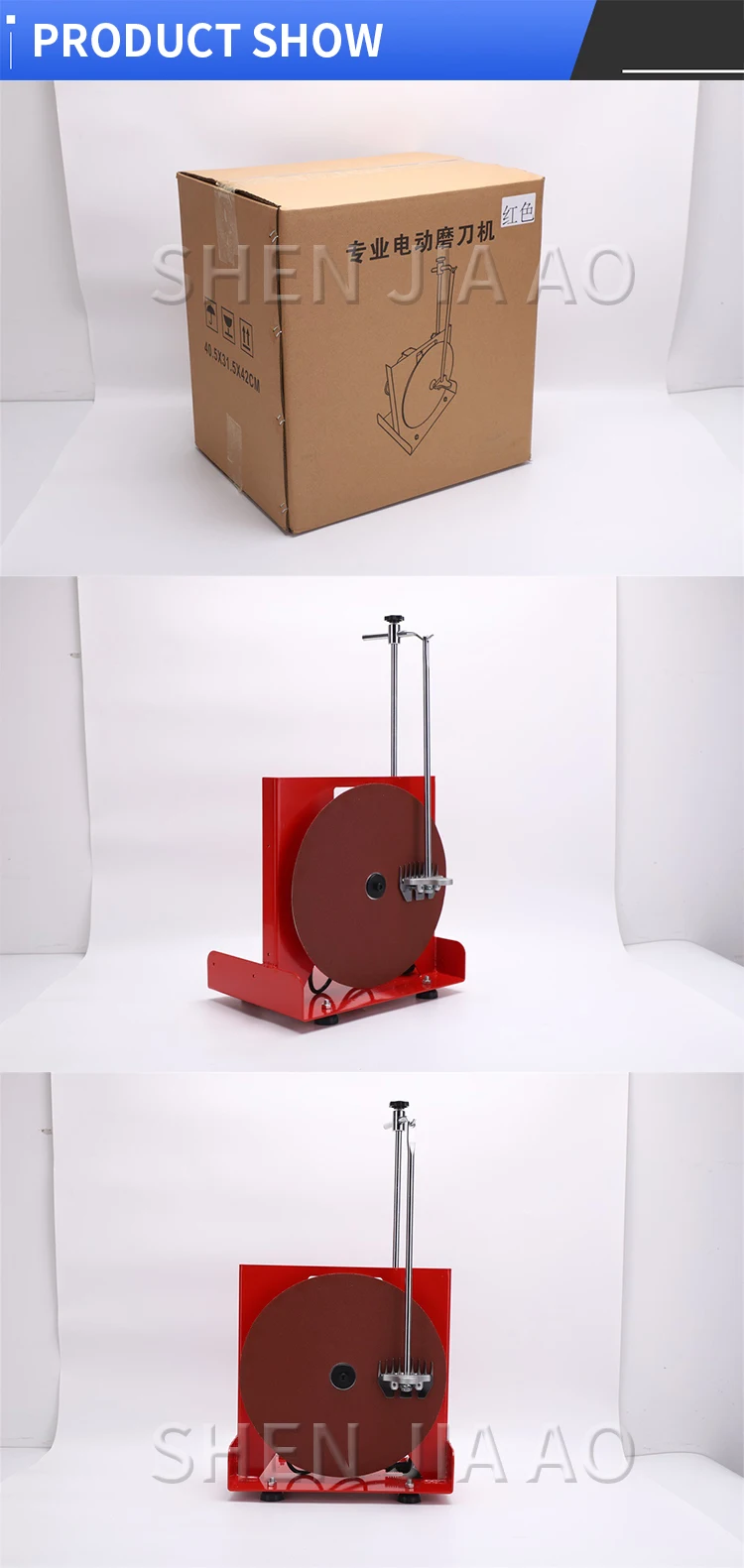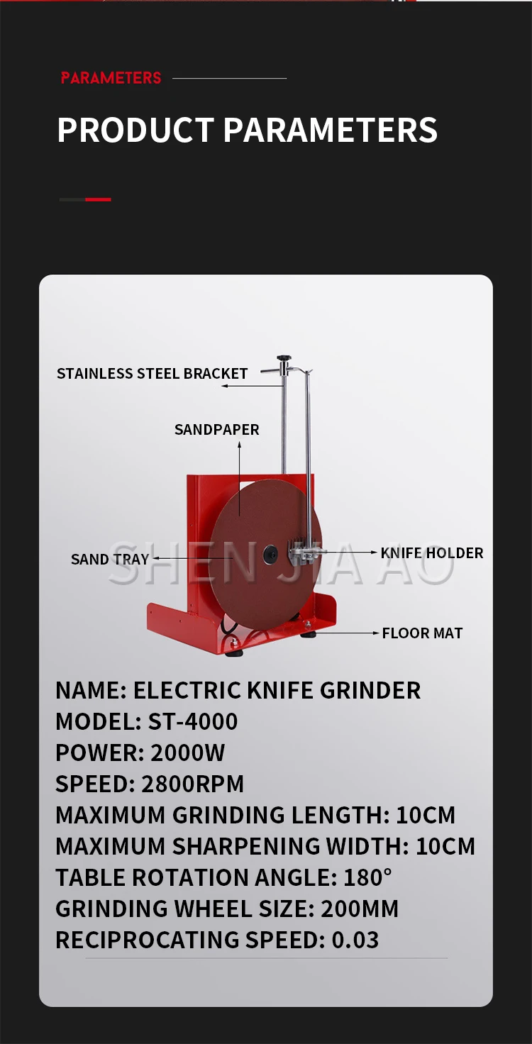 Name: Electric Knife Grinder Model: ST-4000 Power: 2000W Speed: 2800RPM Maximum grinding length: 10CM Maximum sharpening width: 10CM Table rotation angle: 180° Grinding wheel size: 200MM Reciprocating speed: 0.03