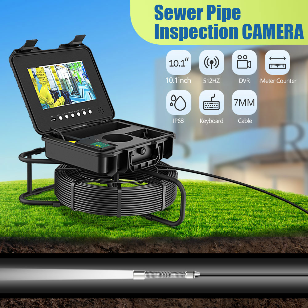 7MM Fiberglass Cable Sewer Pipe Inspection Camera 10.1 Inch IPS 1080P Screen and Meter Counter+ 512HZ Locator Video+Audio Recording 5X Image Enlarge