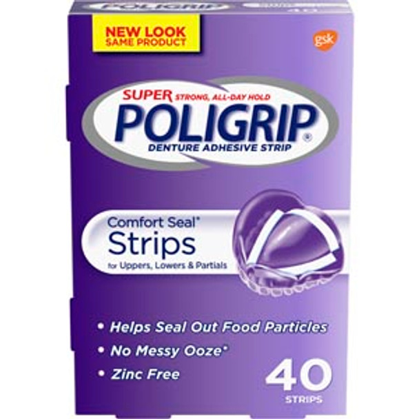 GSK Super Poligrip Denture Adhesive Comfort Seal Strips, 40 strips/box, 6 boxes/pkg, 4 pkg/cs (24 -40ct boxes total). If you are looking for all-day hold, with the convenience of an easy application and mess-free format, Super Poligrip Denture Adhesive Comfort Seal Strips are the best solution for you.
