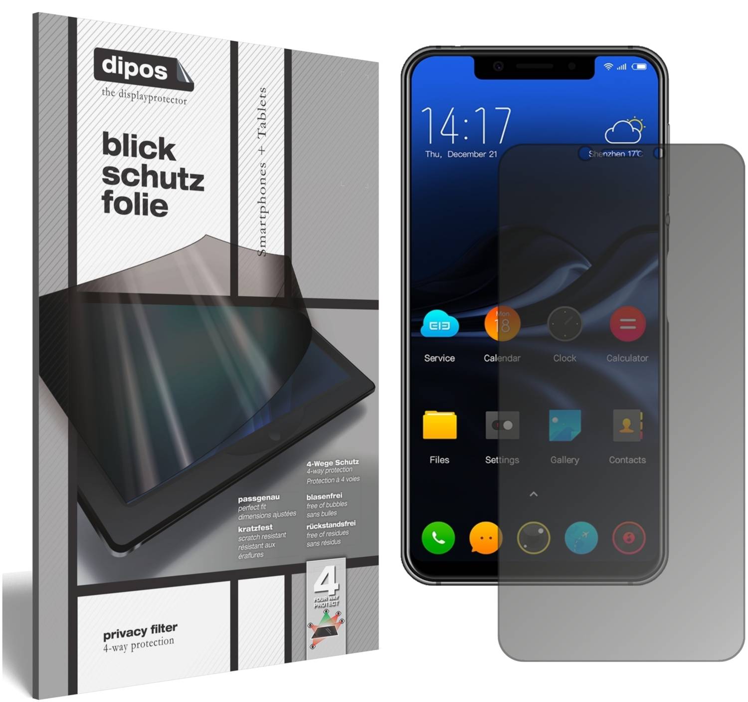 - ¡Extremadamente resistente a arañazos gracias a su superficie especial con revestimiento duro! ¡El filtro protector de miradas dipos Elephone A4 es muy resistente ante arañazos y abrasión!
