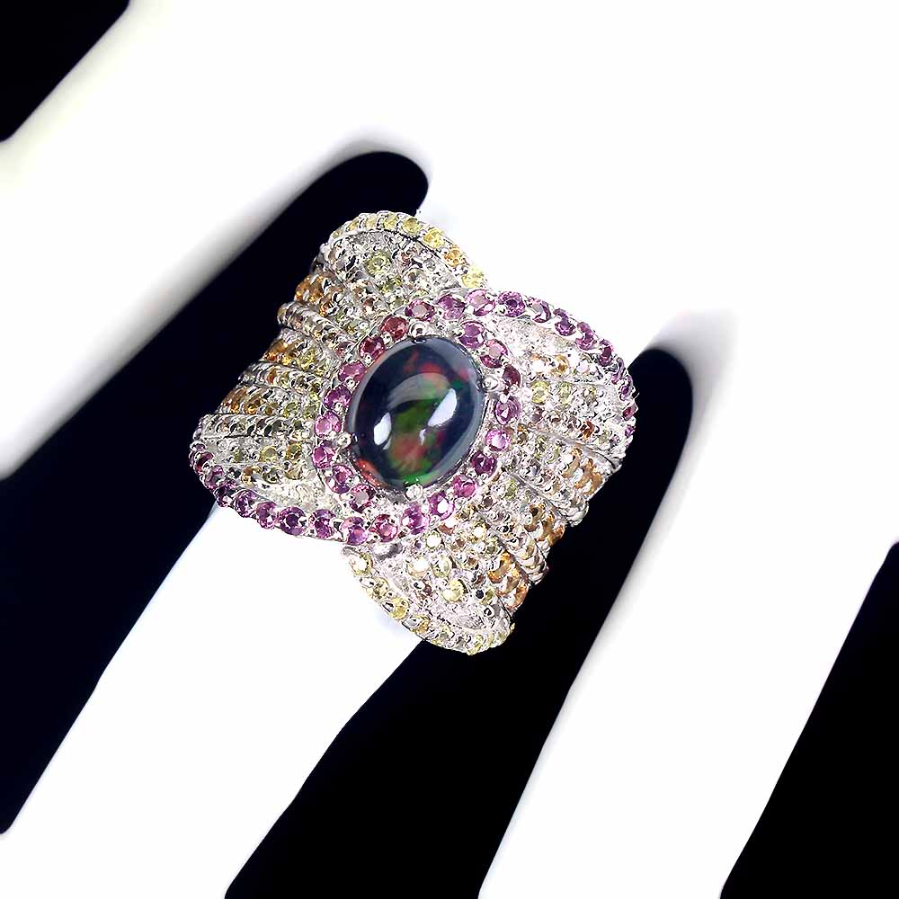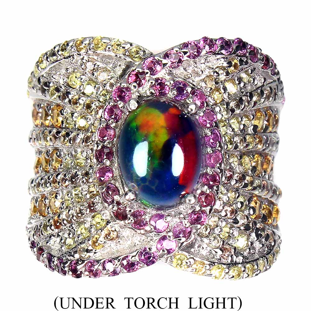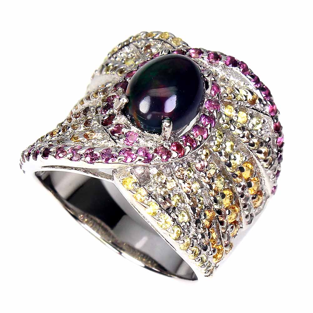 Oval Black Opal 9x7mm Sapphire Diamond Cut Gems 925 Sterling Silver Ring Sz 7.5