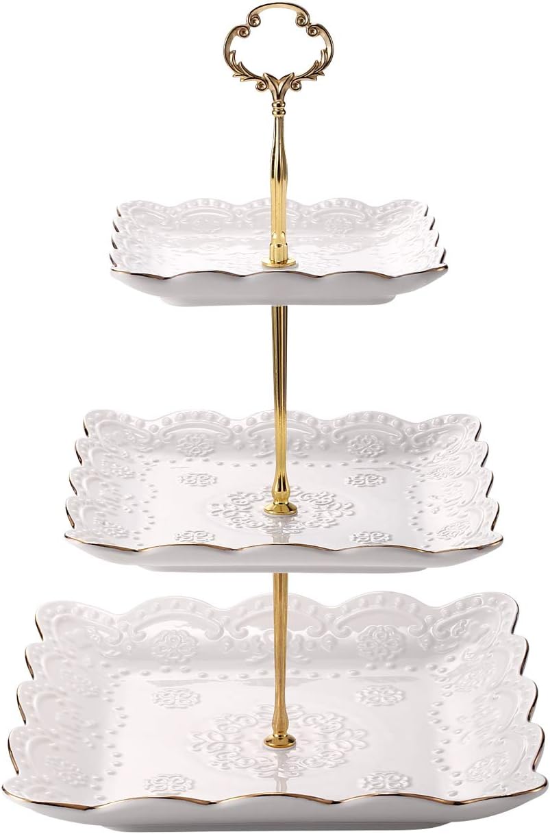 Exquisite porcelain embossed dessert stand, decorated with gold edges and sturdy gold stents, show all kinds of food to impress guests with special visual beauty, perfect for desserts, brownies, finger foods, and party appetizers.