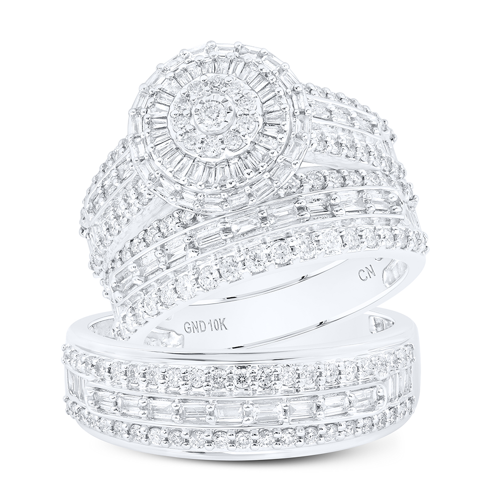 (12 gr. of 10K White Gold | Total Carat Weight: 1.75 ct. t.w. of White Diamonds | Clarity: SI1 - SI2 | Color: H - I | Men's and Women's Genuine Round & Baguette Cut Diamond Matching Diamond Flower Trio Bridal Set Rings)