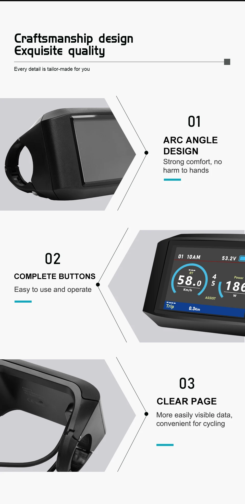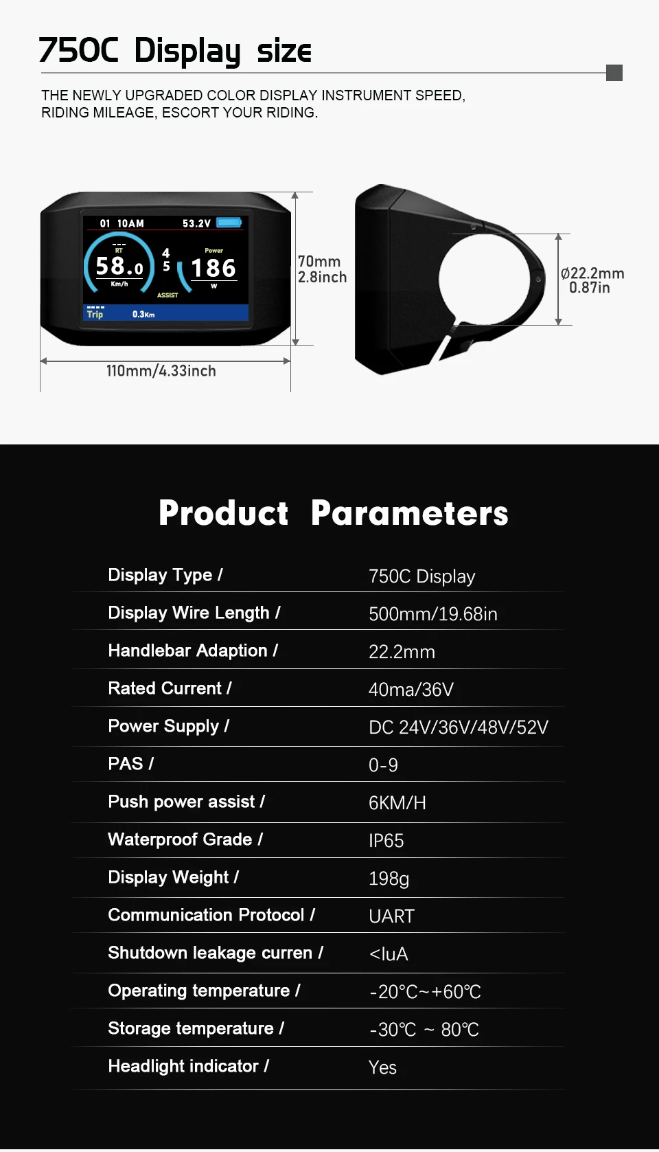 •Mileage indicator: Odometer/ Trip distance/ Clock/ Riding time/ Range.