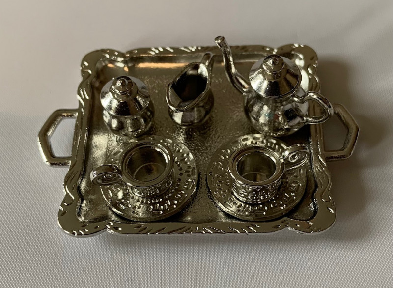 Dimensions: Tray Length 6.5cms including handles, width 4.5cms and depth 0.5cms. Saucers 2cms Diameter, Coffee Jug Height 2cms Width 2.5cms Including Handle, Milk Jug Height 1.3cms Width 2cms, Sugar Bowl Height 1.5cms Width 1cm, Cups Height 0.6cms Width 1.5cms Including Handle
