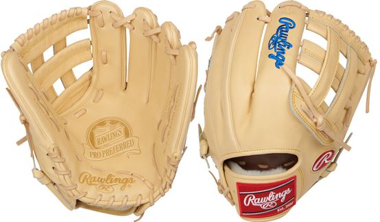 New Rawlings Pro Preferred Series 12.25" RHT Infield Glove (2021) Camel/Blue More pros trust us than any other brand, and the Rawlings 2021 Pro Preferred Kris Bryant gameday glove is one of the many reasons why. This 12.25-inch utility glove is crafted from flawless full-grain kip leather for an unrivaled look and feel. As a result, you'll get pro level quality to help you make plays just like Kris Bryant. Our Pro Preferred gloves all come with Pittards sheepskin palm lining, which offers a feel you can't find anywhere else. Not only did this lining set the standard for superior comfort, but it also wicks away moisture too. In addition, this gamer's pro H-web gives you the perfect amount of pocket depth, so you can make quick plays across the field. All of this is packed into the same classic camel design used by Bryant throughout his career. This 12.25-Inch Pro Preferred glove offers extreme versatility for those who play both outfield and infield. That's why it's a perfect choice for elite 'utility' players who play multiple positions. Order yours now!