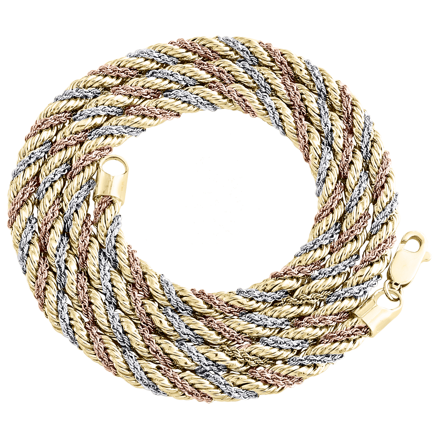This real 10K Tri Color Gold Braided Fancy Rope Chain is presented in lustrous gold, finished with a professional bright high polish for extra shine and luster. This chain is 4.5mm wide and is available in 22 inch length. The weight is approx. 20.2 grams for this chain. This chain is ideal for everyday wear. The bracelet has a lobster clasp so it is easy to put on and take off.
