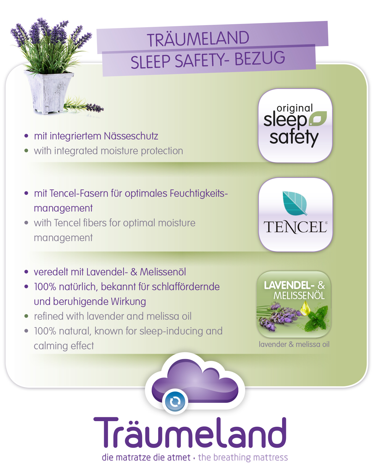 - mit integrierten Nässeschutz: der sleep safety Matratzenbezug nimmt die Feuchtigkeit an der Oberfläche auf und lässt sie nicht in den Matratzenkern eindringen