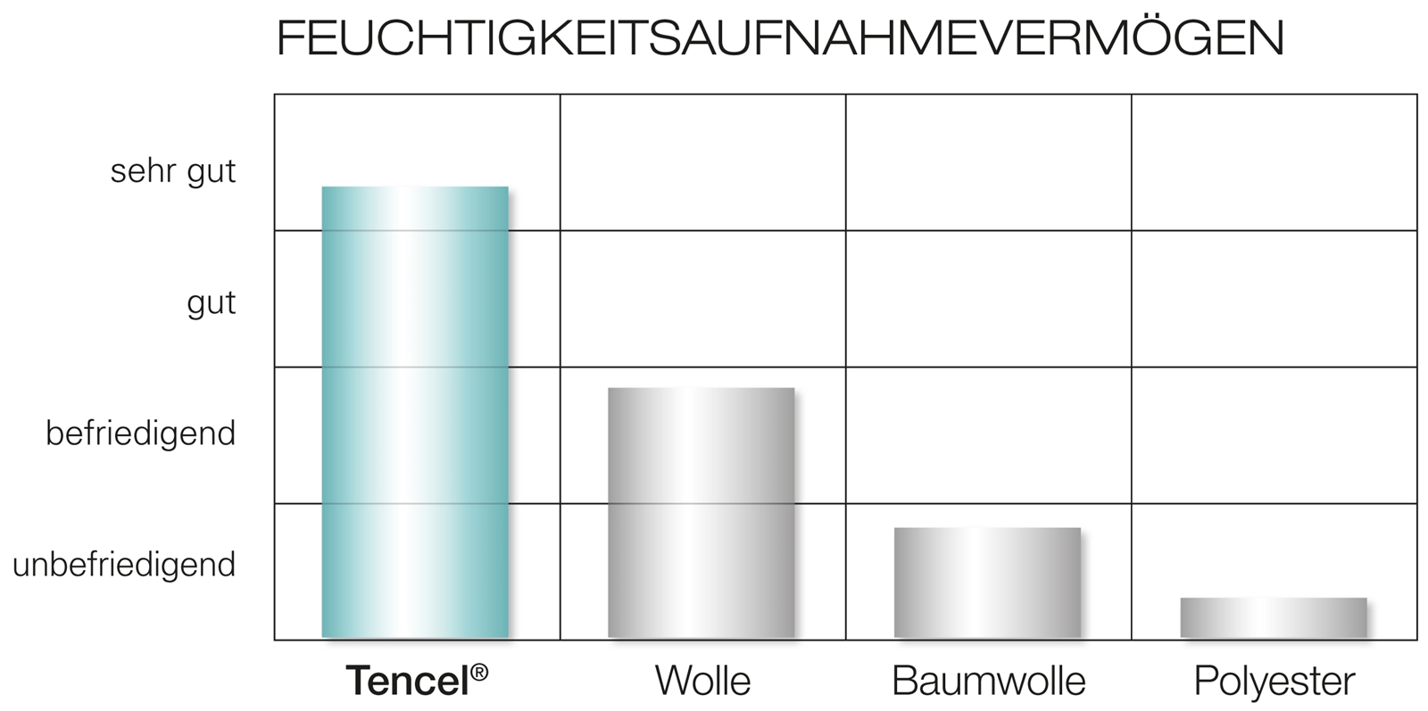Tencel® ist eine Cellulosefaser und wird in einem umweltschonenden Verfahren aus Holz gewonnen (Europäischer Umweltpreis). Tencel® nimmt 130% mehr Wasserdampf auf als Baumwolle und sorgt dadurch für ein gesundes, trockenes Schlafklima. Zudem vereint Tencel® die Vorzüge vieler Fasern: ist fein wie Seide, stark wie Polyester, pflegeleicht, kühl und angenehm wie Leinen und warm wie Wolle.