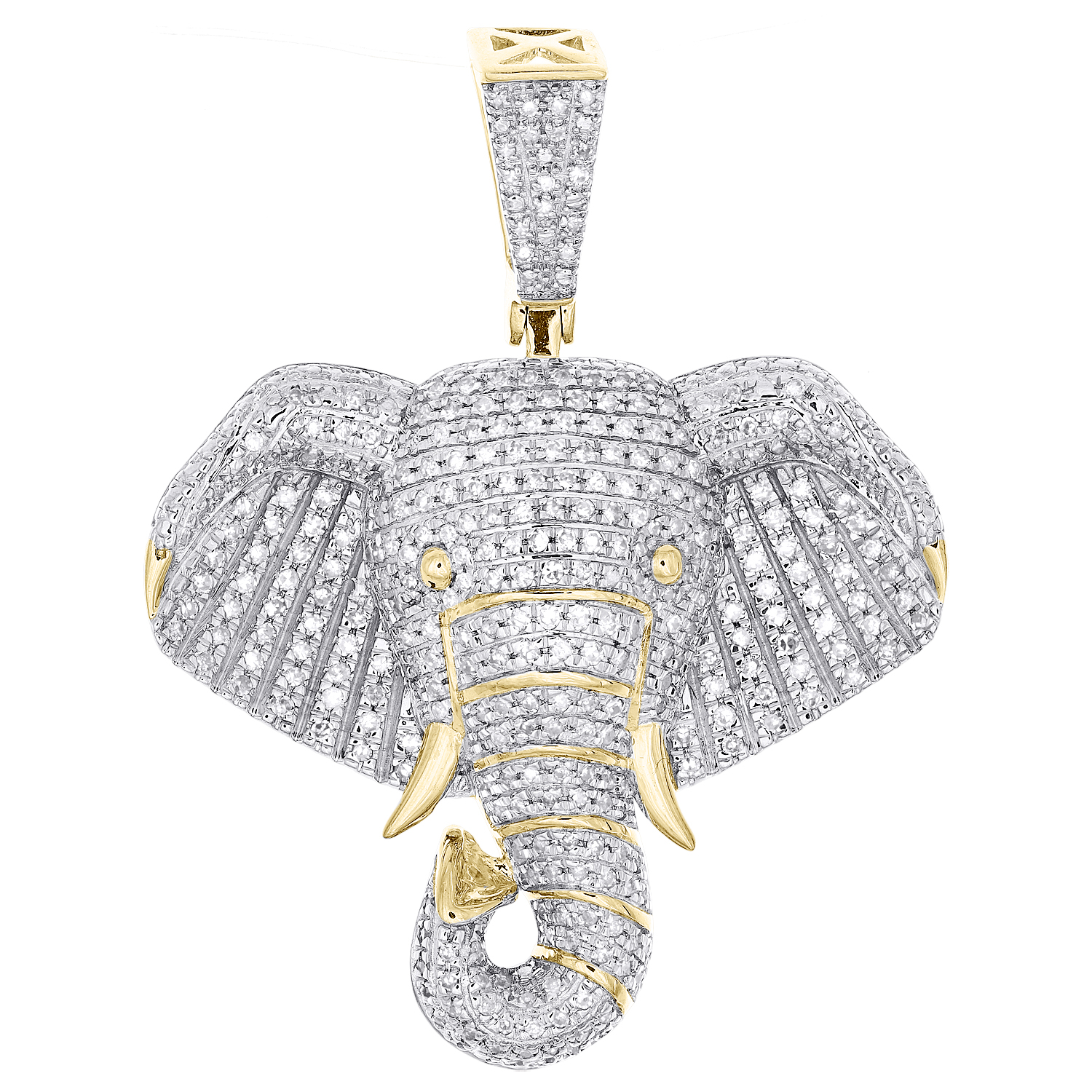 This eye-catching diamond Elephant Pendant Statement Charm is casted in solid 10k Yellow Gold and shimmering White diamonds, ensuring sparkle from every angle. Radiant with 0.75 ct. t.w. of diamonds, this pendant is polished to a lustrous shine. Exclusive style has a well built frame with a Cage back to withstand everyday wear and tear. The diamonds are secured in Pavé setting close together, making the overall appearance larger and lustrous. Exclusive bail to compliment this pendant. These are all 100% genuine Round cut diamonds with matching clarity and color throughout. This pendant measures 1.50" (including bail) long and weighs approx. 7.7 gr. This one of a kind piece would make a perfect addition to your jewelry collection.