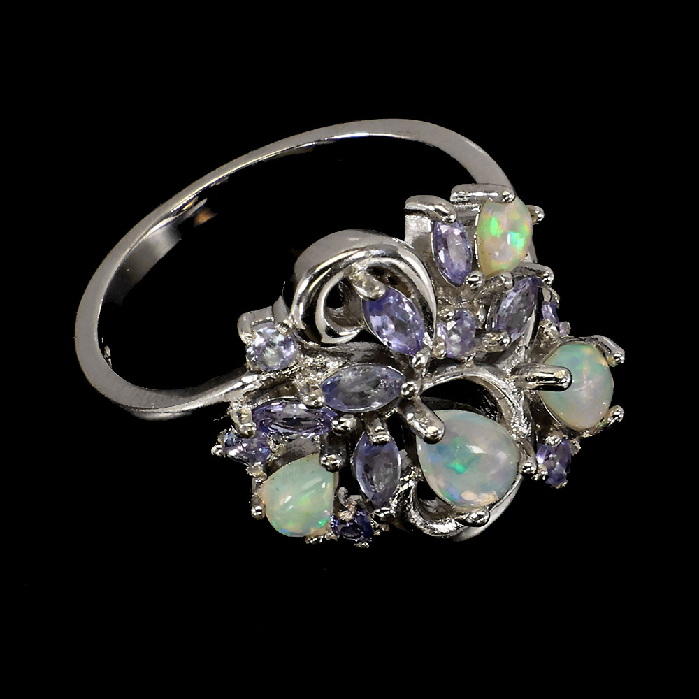Unheated Pear Fire Opal Rainbow 6x4mm Tanzanite 925 Sterling Silver Ring Size 8
