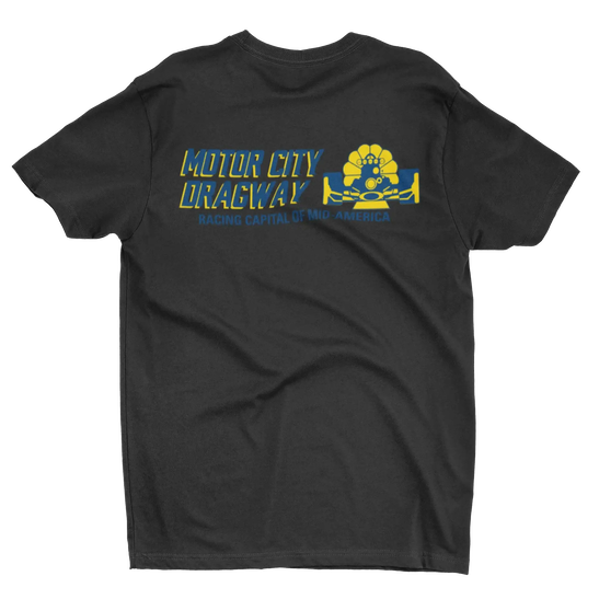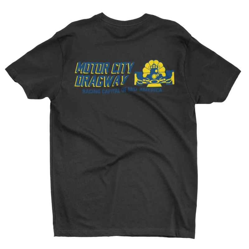 The shirt features a sleek black design with the iconic Motor City Dragway logo prominently displayed on the back. The classic fit and crew neck design make it suitable for all body types, while the short sleeves provide a cool and casual look.