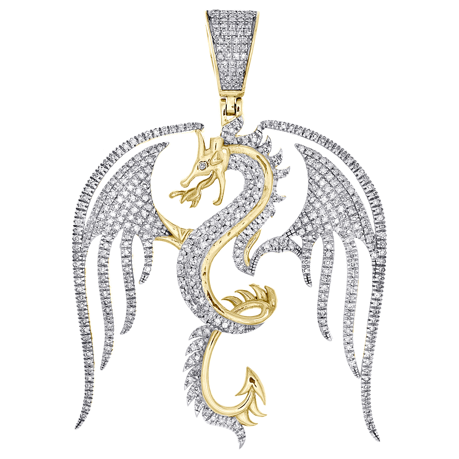 This eye-catching diamond Fire Dragon Pendant Statement Charm is casted in solid 10k Yellow Gold and shimmering White diamonds, ensuring sparkle from every angle. Radiant with 0.91 ct. t.w. of diamonds, this pendant is polished to a lustrous shine. Exclusive style has a well built frame with a Open back to withstand everyday wear and tear. The diamonds are secured in Prong setting close together, making the overall appearance larger and lustrous. Exclusive bail to compliment this pendant. These are all 100% genuine Round cut diamonds with matching clarity and color throughout. This pendant measures 2" (including bail) long and weighs approx. 8.7 gr. This one of a kind piece would make a perfect addition to your jewelry collection.