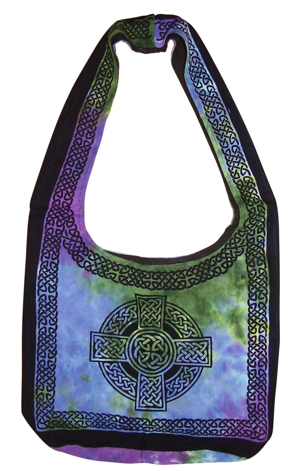 CELTIC HOBO BAG ~ Sturdy Celtic tie dye hobo bag made of 100% heavy cotton. Measures 15 inches wide X 12 inches tall with a 15 inch shoulder strap. It is cotton lined with a zipper enclosure and has a 4 inch flat bottom. The Celtic design is on both sides of this hobo bag. They can be machine washed separately on cool/gentle and tumble dried. Please note that bag is representative of what you will receive as each bag is individually hand dyed and no two are ever alike. The interlacing symmetry of Celtic knot work has fascinated man for centuries. Each knot consists of a single strand that has no end or beginning, representing the infinity of the universe and life. The overlapping complexity represent the ever-changing and complicated connections between nature, humanity, and the Gods.