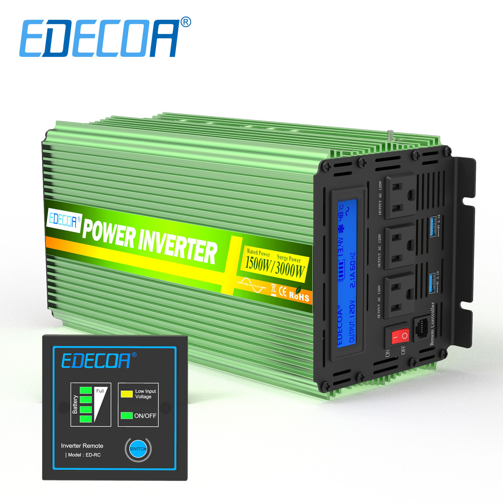 EDECOA Intelligent Inverter can supply 1500W continuous power/3000W max peak power.Connecting the inverter to battery,it can convert 12V DC to 110v 120V 60HZ AC.