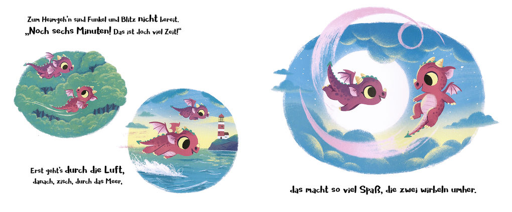 In zehn Minuten ist Schlafenszeit, doch der kleine Drache Blitz und seine Schwester Funkel sausen lieber noch ein wenig umher, vorbei am großen Drachenberg, einem prächtigen Regenbogen und einem Drachenei, das aus seinem Nest gerollt ist. Für die Geschwister ist klar: Sie müssen das Ei zu seiner Mama zurückbringen! Nach Einhorn und Dinosaurier setzt der kleine Drache Blitz die erfolgreiche