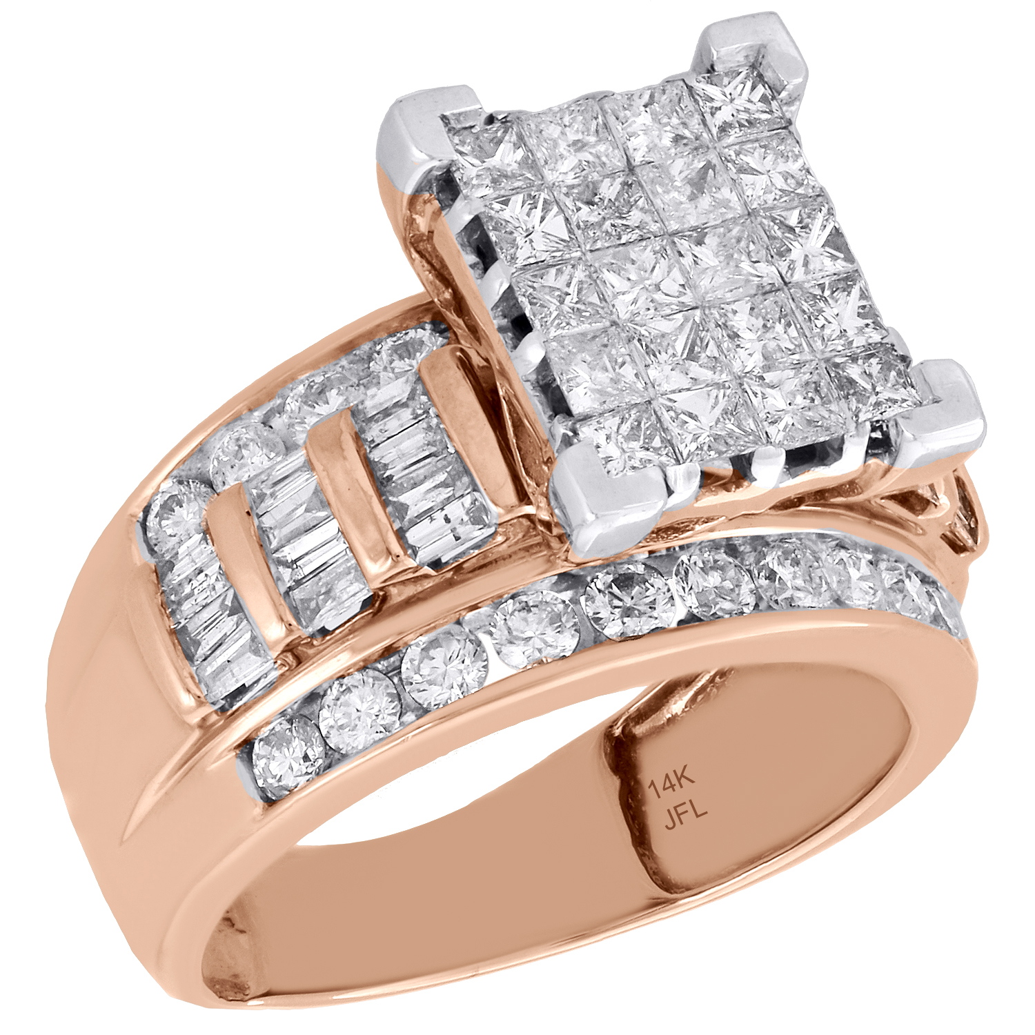 This beautiful white diamond engagement ring is new additions to our diamond ring collection. Crafted in fine 14K rose gold, this exquisite design features a rectangular center The center setting has princess cut diamonds set in an invisible setting close together for a big shine. The shank of this beautiful engagement ring also has invisible set baguette and channel set round diamonds to enhance the look. Radiant with 2 ct. t.w. of diamonds and polished to a bright shine, the diamonds are in invisible and channel setting for a firm and secure hold. All the diamonds on this ring are of equivalent color and clarity, giving this ring a comparable shine and luster throughout.