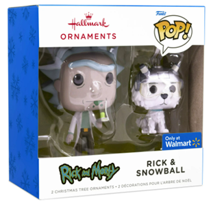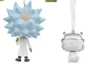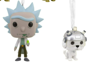 Christmas ornaments feature Rick and Snuffles as scaled-down versions of signature "Rick and Morty" Funko POP! designs.