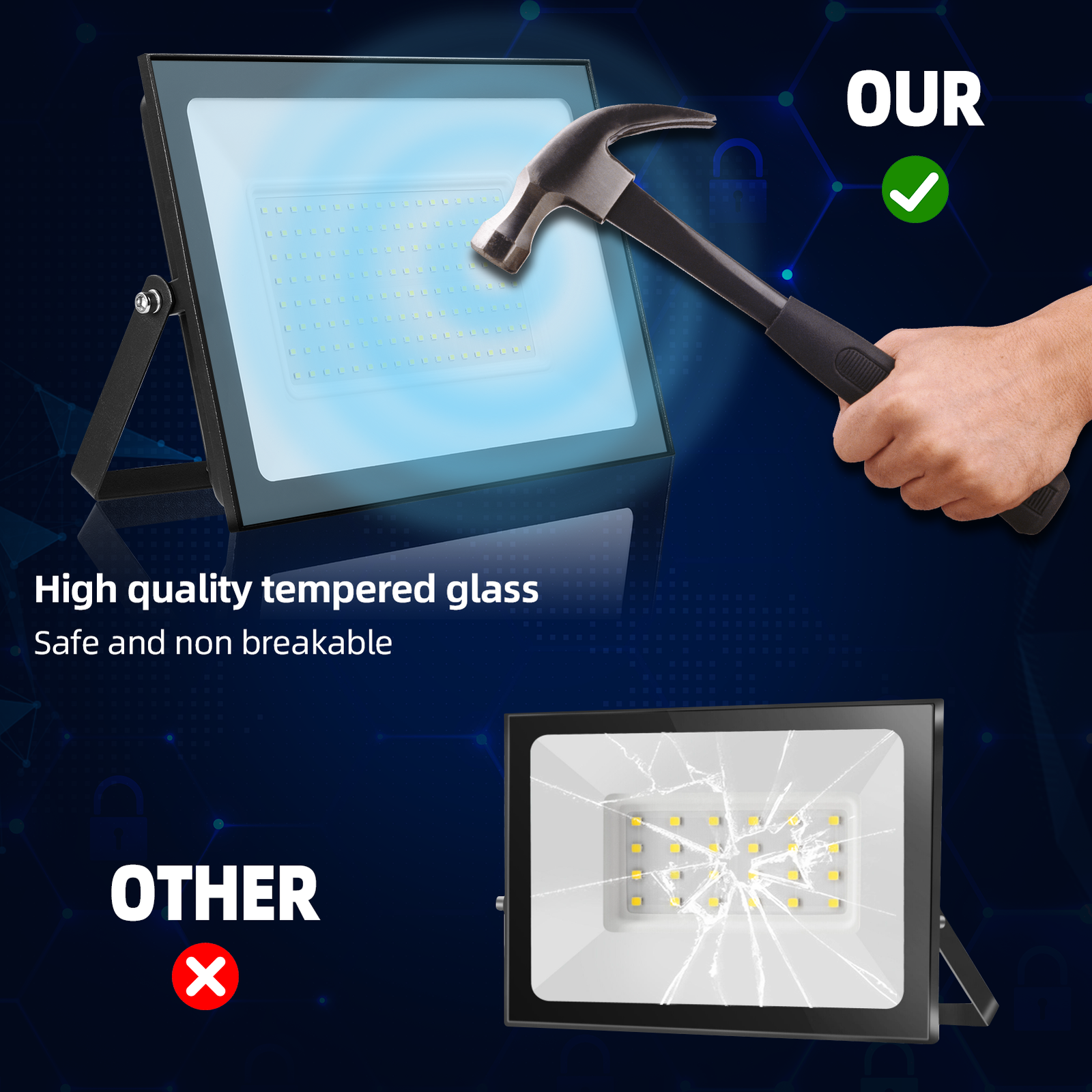 【High light efficiency 】Much higher than similar LED small watt floodlights, compared with traditional halogen floodlights, it saves up to 90% energy and has a lifespan of up to 50,000 hours;